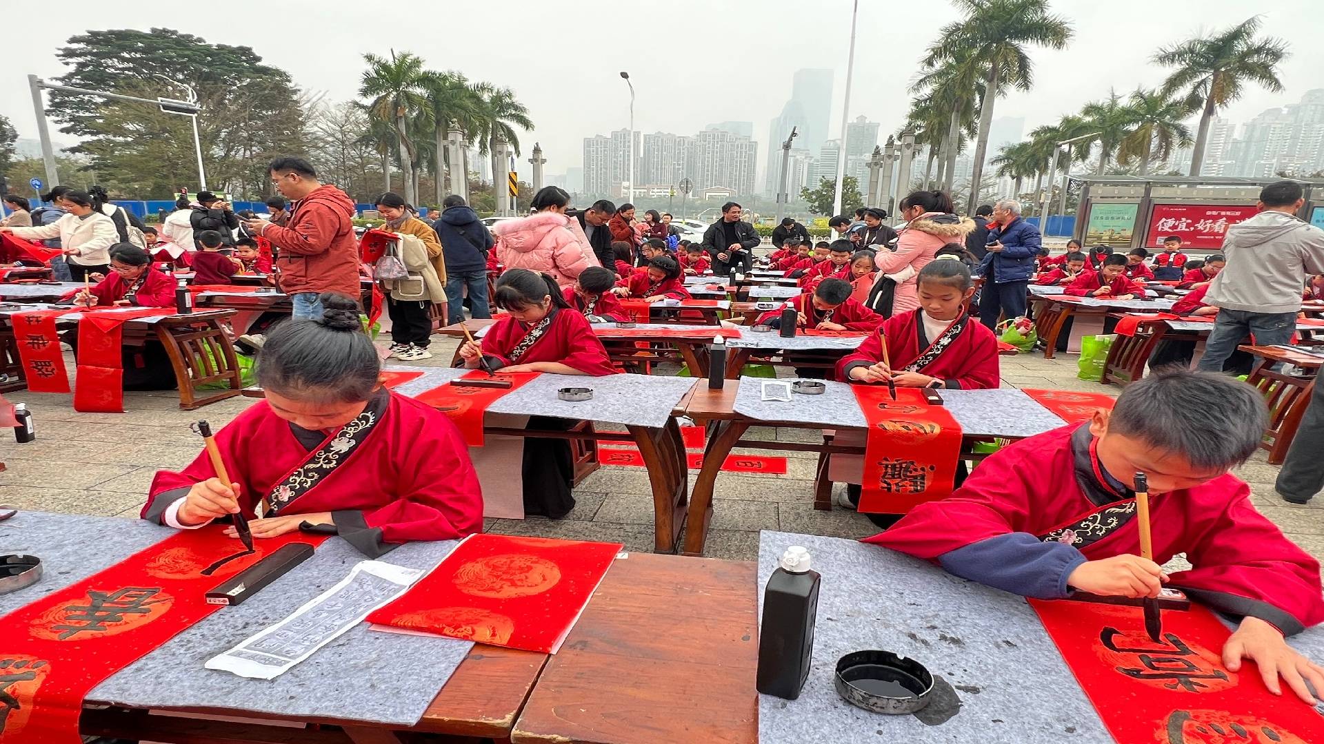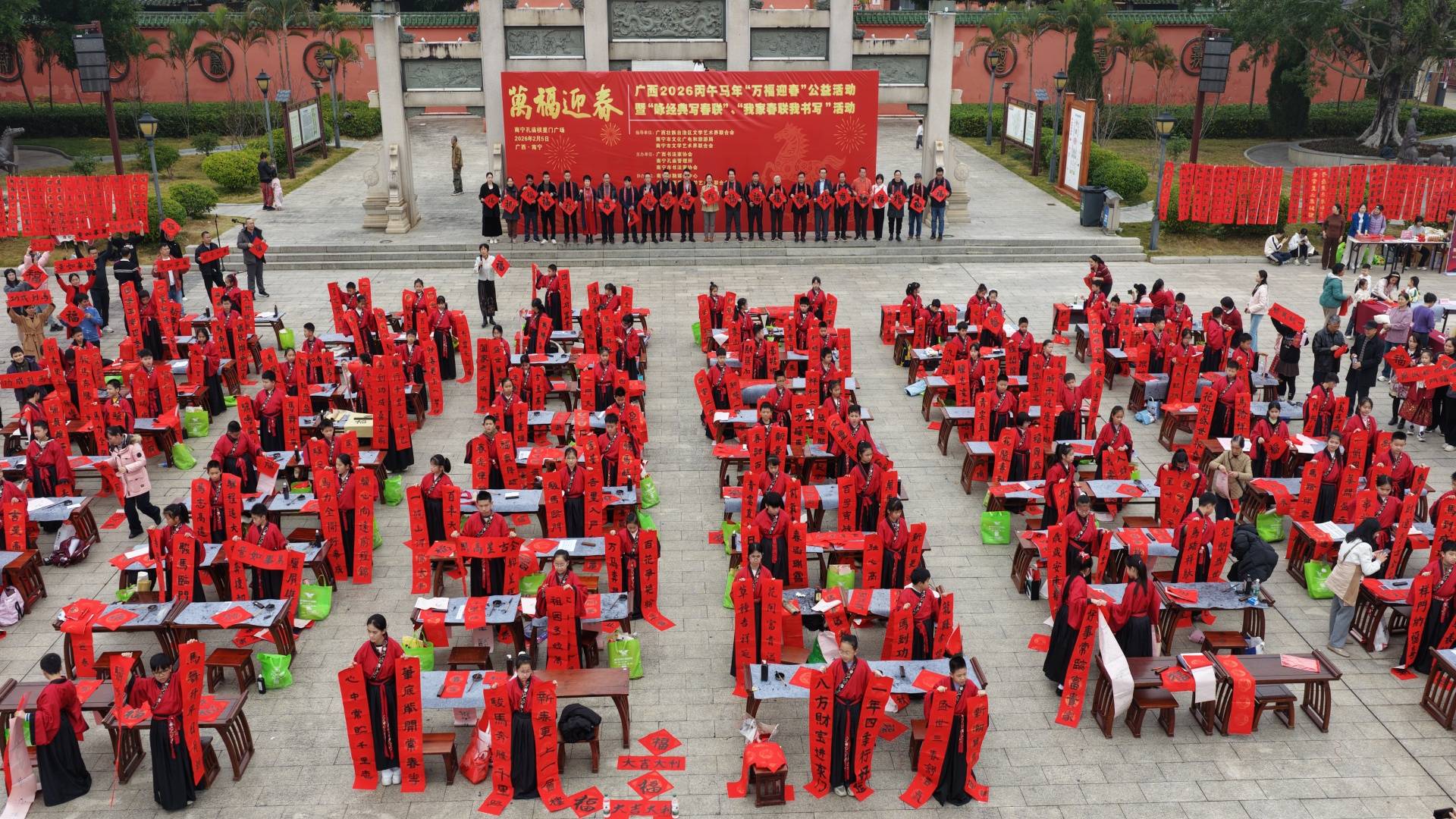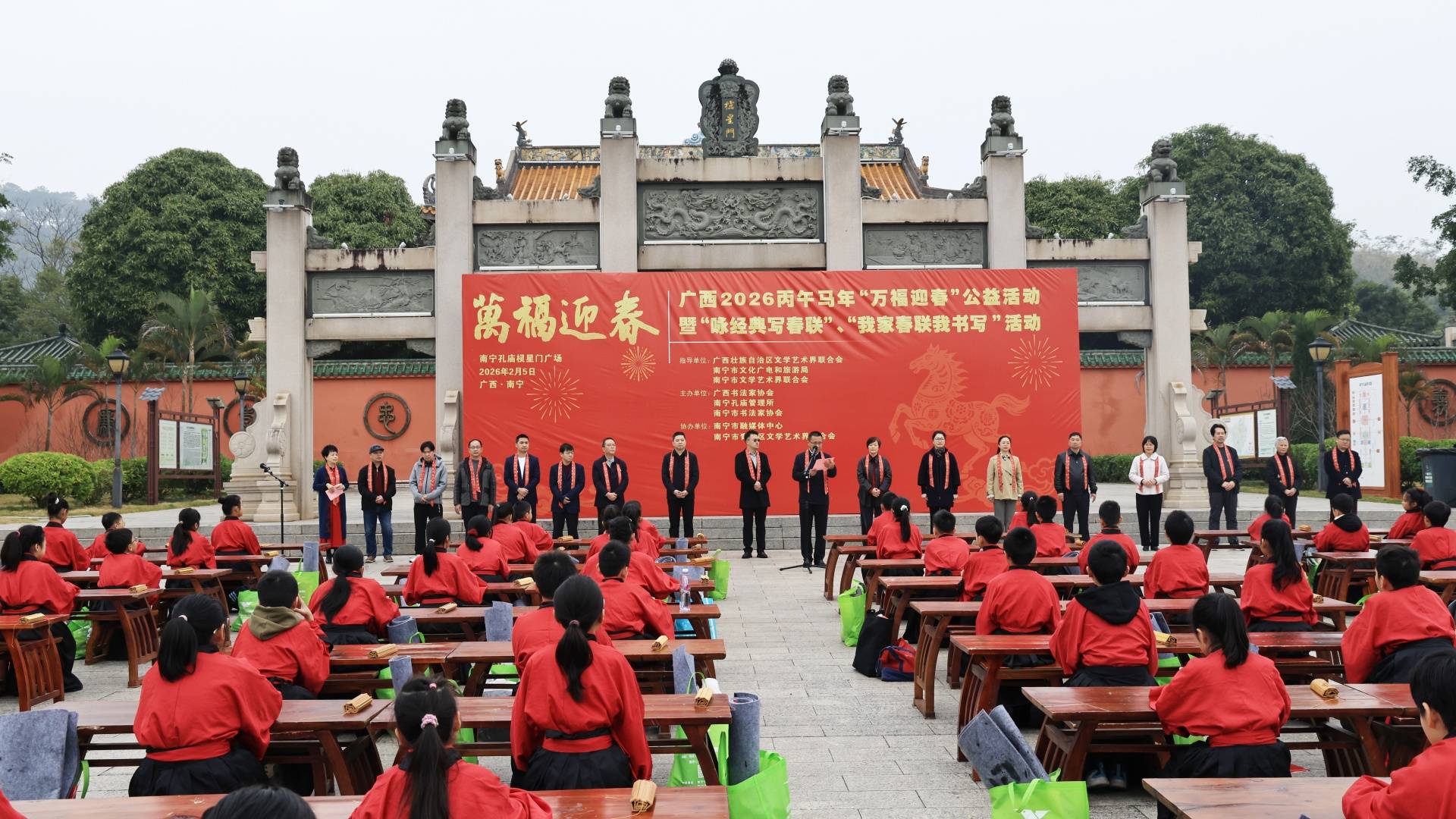 “新年纳余庆,嘉节号长春”,为贯彻落实党的精神,深入学习、弘扬和传承中国传统文化,活跃春节期间南宁市民及少年儿童的精神文化生活,营造健康、祥和、欢乐的节日氛围,2月5日上午,由广西书法家协会、南宁市书法家协会与南宁孔庙管理所联合主办的广西2026丙午马年“万福迎春”公益活动暨“咏经典 写春联”、“我家春联我书写”活动在南宁市孔庙隆重举行。广西的20位书法名家和南宁市少年儿童“书法成长课堂”的120名学生们同台挥毫、书写春联,向大家送上新春的祝福!