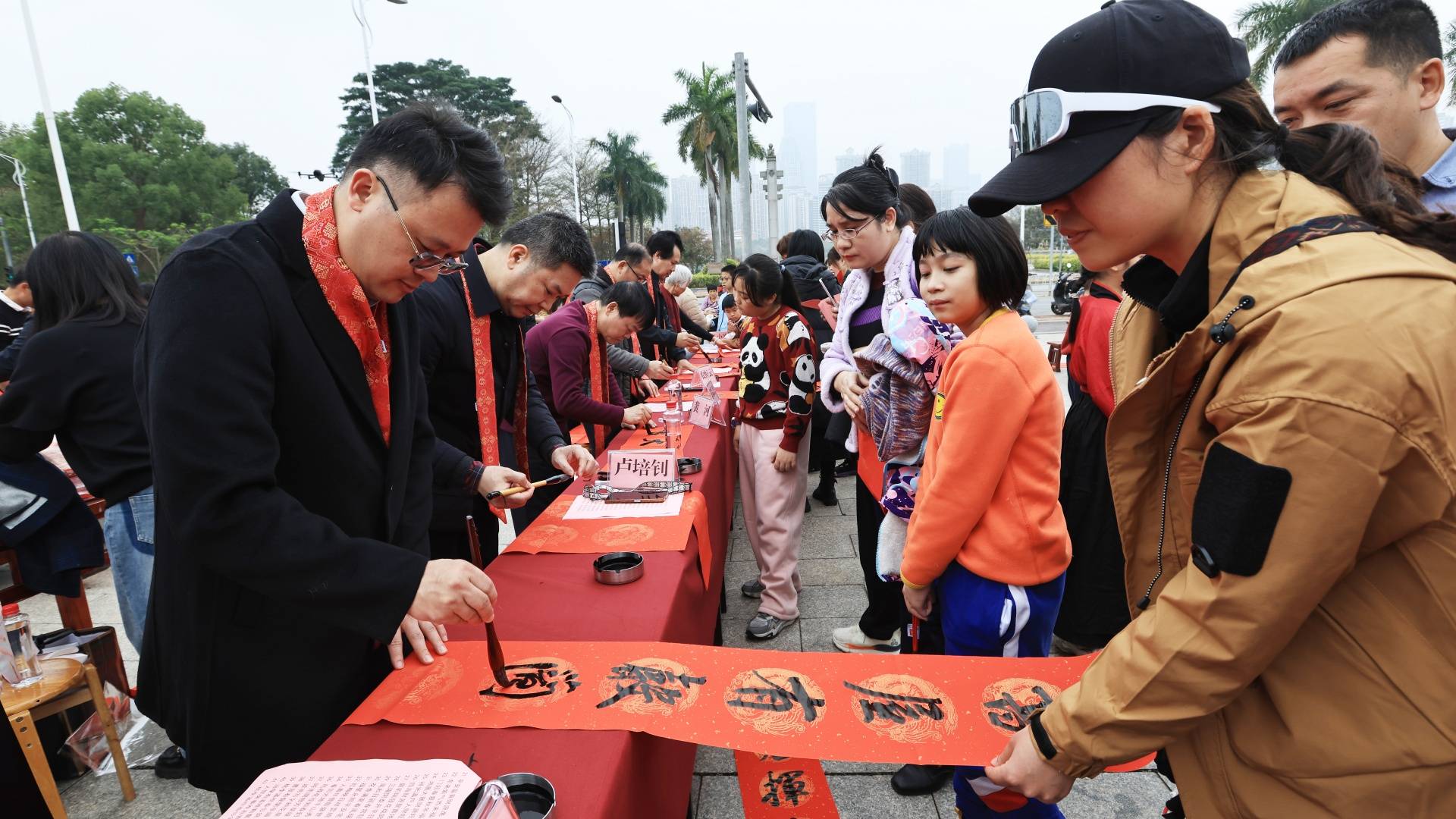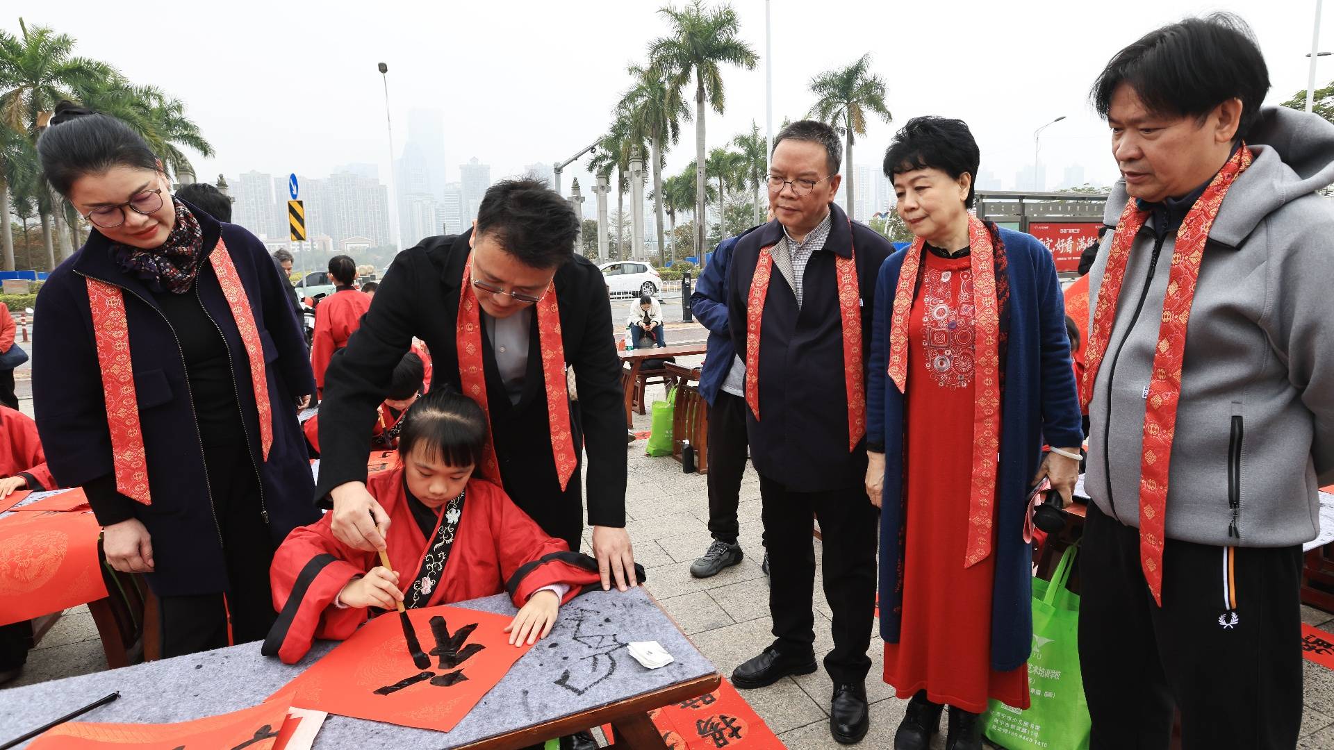红纸铺展,翰墨飘香。在悠扬的背景音乐中,现场气氛瞬间热烈起来,20位书法名家现场挥毫书写饱含吉祥寓意的春联,构成了一幅“墨香伴书香,雅韵贺新春”的动人画卷。这些带着温度的手写春联,赠予市民群众,成为了这个马年春节最有文化味的“年货”,为绿城南宁增添一抹亮丽的中国红。