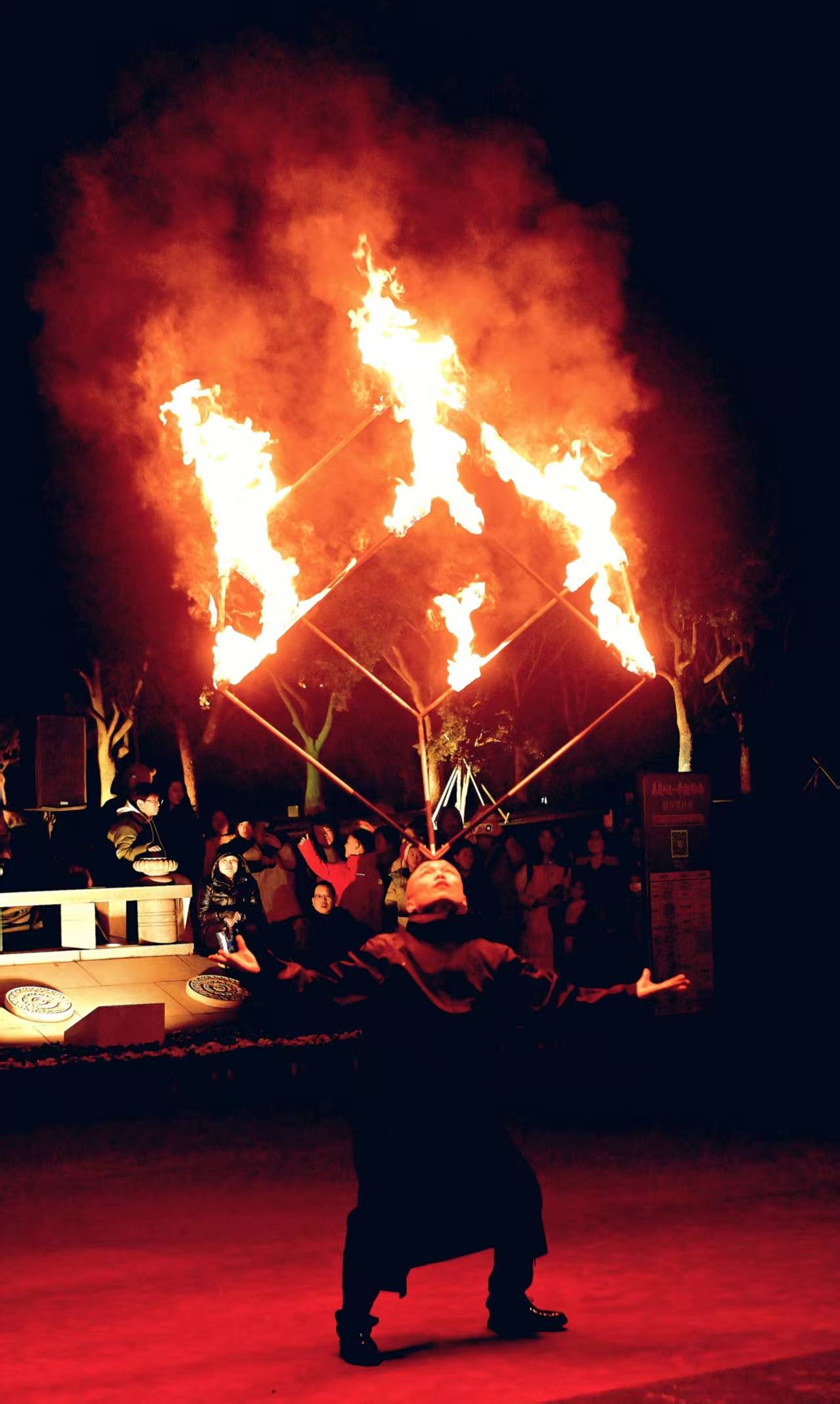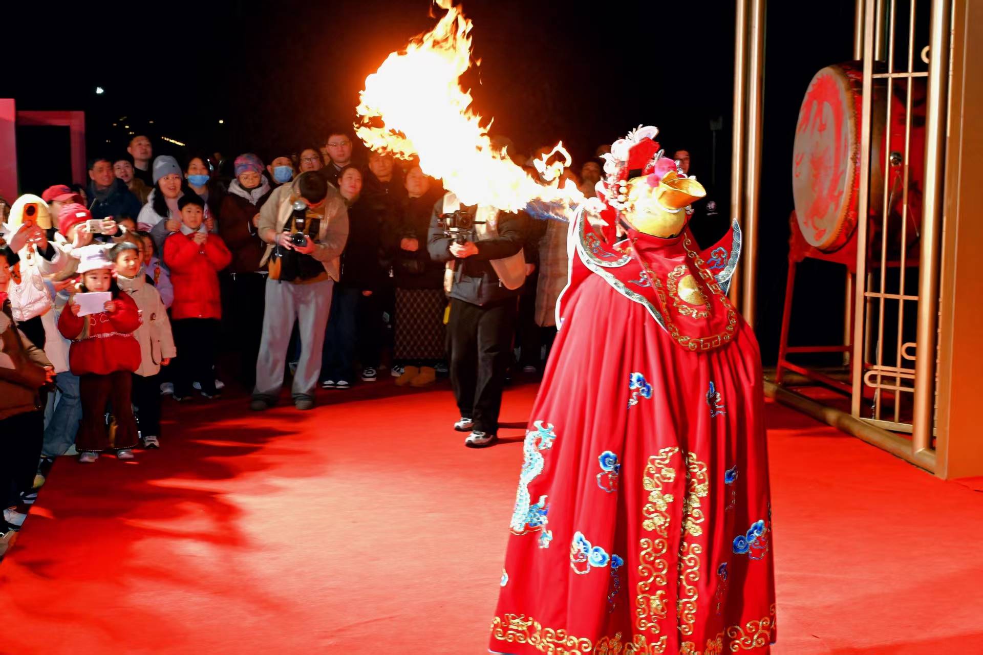 夜幕降临,非遗火舞惊艳亮相,表演者身姿矫健,烈焰凌空舞动,璀璨铁花如星河飞溅,火方阵气势恢宏,千年非遗技艺在火光中尽显锋芒,点燃了全场游人的热情。