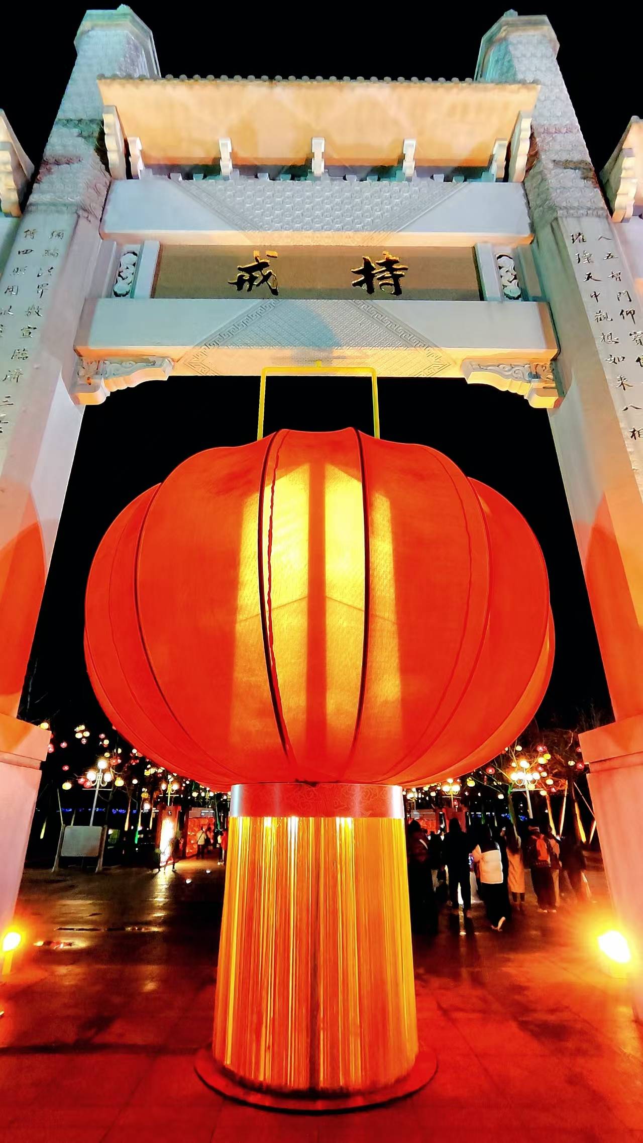 景区内,巨型红灯笼高高悬挂,将庄严的“持戒”牌坊映照得流光溢彩,禅意胜境更显庄重祥和。