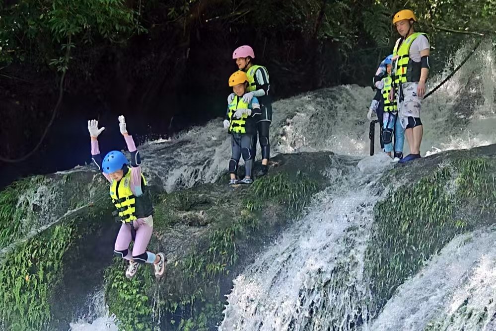 值得一提的是,广西首个溪降项目就在丹炉山景区。这里森林覆盖率达80%,素有“自然氧吧”之美誉。在这里体验溪降,可在清澈峡谷溪流中摸着石头过河,全程在凹凸不平的溪道中顺溪而下,穿越峡谷,还能从崖口一跃而下,扎进清澈的翠绿深潭,在山风和水珠的轻拍下,感受清爽与心跳加速的双重快感,体验前所未有的畅快淋漓。该项目全长约 3 公里,总落差约 150 米,游玩约 2 - 3 小时。这里水温常年保持在20℃左右,潺潺溪水沁凉宜人,是夏季逃离酷暑、觅得清凉的绝佳去处。其核心玩法丰富多样,包括溯溪徒步、人体漂流、瀑布跳水、水上攀岩、水上飞拉达、瀑降(绳降)、深潭畅游、丛林穿越等 8 种玩法。该项目适合6岁以上人群体验,亲子友好度拉满,即便不会游泳也能放心参与——全程有专业教练带队保驾护航,配备救生衣,还会进行分段保护、全程跟拍,中途设有补给站,免费提供暖心姜茶和可口烧麦。游客游玩时需准备速干衣裤、溯溪防滑鞋(景区可租/买)、换洗衣物、毛巾、防水手机袋、防晒用品、能量零食等物品。