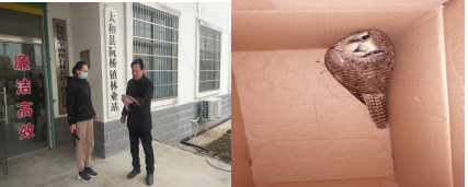 该青年感觉很奇怪,这只鸟从未见过,心想如果不管,这只小鸟很可能被严寒的天气冻死或者被其它动物伤害,可是想救也不知道该如何拯救它,经过反复思考,郑玉坤还是主动拨打了求助电话110。公安接到报警后,详细了解情况后,让他将那只不知名小鸟送到当地村委会,紧接着村委会干部汪贺和李天飞,就小心翼翼地,将小鸟送到镇国土所,并及时和县森林派出所取得了联系,并汇报了整个过程。由于天色很晚,太和县森林派出所告知阮桥镇国土所,提醒所长宫春灵先保护好那只奇怪的小鸟。第二天,太和县森林派出所到镇国土所进行了甄别,经查看原来这只奇怪的鸟是国家一级保护动物,名字叫猎隼。并按程序向阜阳市森林资源保卫处进行了移交。截止到2022年1月14日的下午五点,针对这种稀有鸟类的保护大行动,才算划上一个圆满的句号。