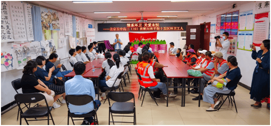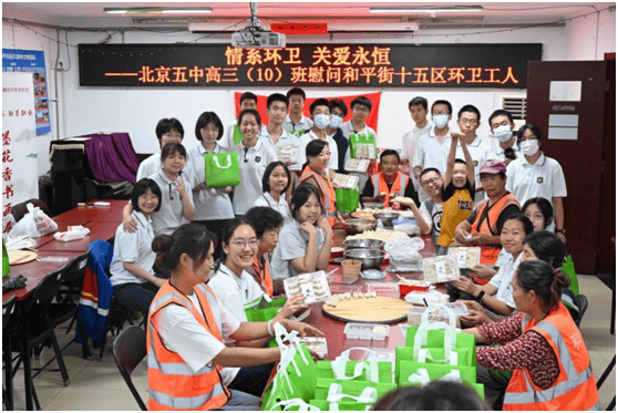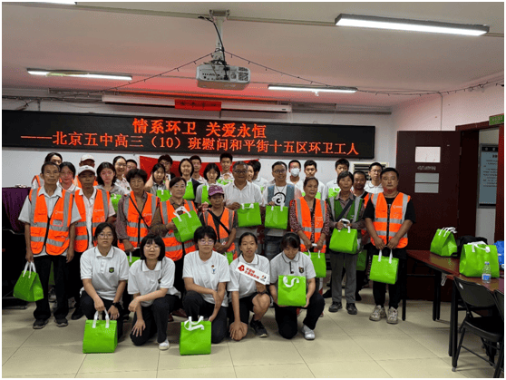 ——北京五中高三(10)班慰问和平街十五区环卫工人 秋日未深,情已浓浓。熟悉的街道和社区,熟悉的身影和笑容,2024年8月31日,北京市第五中学高三10班的志愿者师生和家长,再一次走进北京市朝阳区和平东街社区居委会,开展“情系环卫 关爱永恒——慰问和平街十五区环卫工人”志愿活动。 早上10点的活动,不少志愿者主动提前到场,准备活动所需的打包袋、饺子盒等材料。尽管是活动之外的工作,大家仍然心照不宣地主动揽活、互帮互助。似乎在活动开始之前,劳动的价值,早已潜移默化,渗透在每个人心中。