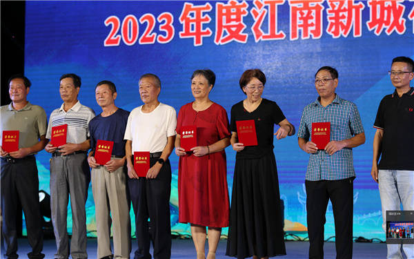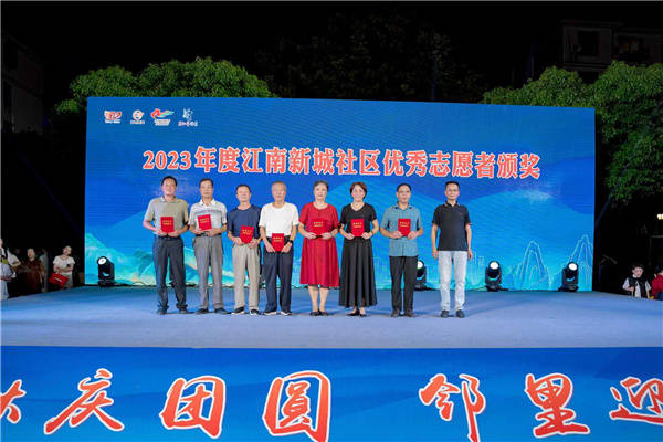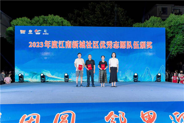 本次晚会以江南新城社区阳光明媚舞蹈队的开场舞《五星红旗》拉开帷幕,队员们身着鲜艳的红装裙,以矫健的舞姿展现了新时代新老年人的活力与爱国情怀。随后,谭家岭村戏曲队献上越剧《歌唱人民解放军》,深情的演唱和精湛的表演让现场观众仿佛穿越回到那个英雄辈出的年代,感受历史的厚重与辉煌。 晚会中,江南新城社区特别设置了“2023年度最美志愿者颁奖”环节,对在社区服务中做出杰出贡献的志愿者们进行了表彰,弘扬了无私奉献、乐于助人的社会正能量。此外,江南新城小学的学生们带来了时装秀《霓光·幻梦》,他们身着精心设计的服装,自信地走在T台上,展现了新时代青少年的风采与创意。