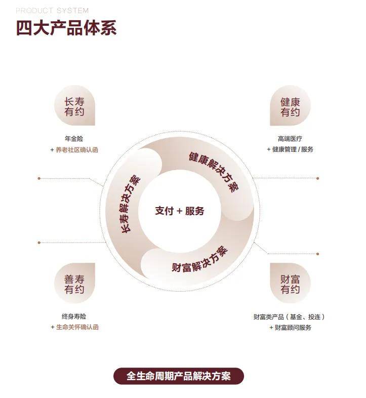 泰康新寿险模式 从具体实践来看,以泰康创新商业模式的核心体现“幸福有约”为例,早在2012年,该产品就将虚拟的保险金融产品与实体养老服务有机结合,本次王先生购买的惠赢智选幸福300计划,本质上也是通过对接幸福有约旗下的“长寿有约”产品,为王先生锁定了泰康之家养老社区入住权。 2022年“幸福有约”推出“长寿有约、健康有约、财富有约、善寿有约”四大产品体系。“长寿有约”沿袭“幸福有约”经典模式,用年金险链接养老社区入住确认函,通过养老资金和资源的统筹,为百岁人生保驾护航。在“幸福有约”基础上,保险金信托、家族办公室陆续推出,六大私享服务体系持续更新。