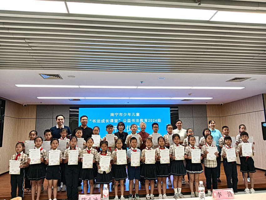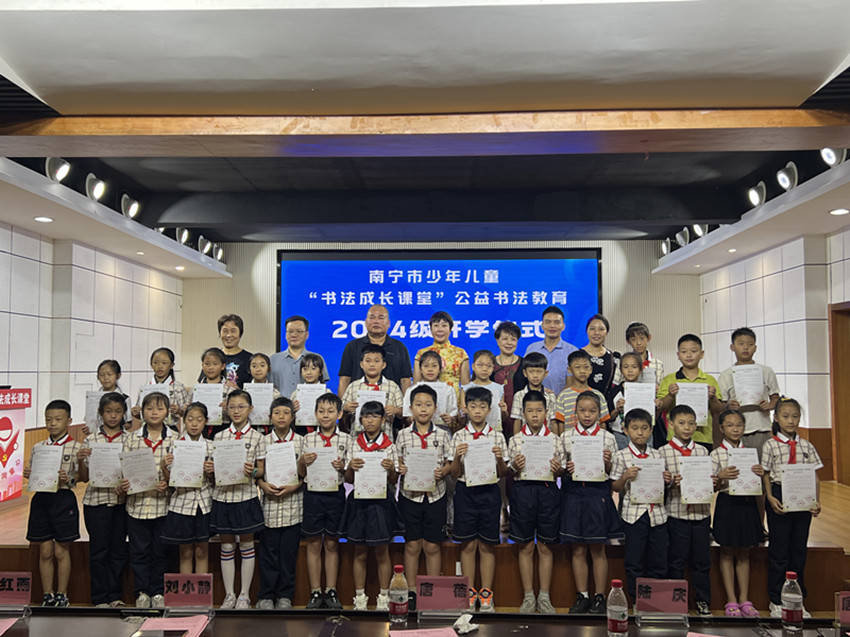 南宁少年儿童“书法成长课堂”公益书法教育是在南宁市文联倡导下,由南宁市书法家协会联合南宁市青秀区文联、南宁市少年儿童图书馆、南宁市工人文化宫、南宁市书羽艺术培训学校共同开办的少儿书法公益学堂,今年8月,经青秀区、兴宁区各个小学推荐、南宁市书法家协会评审组公平公正公开面试评选,择优录取了“书法成长课堂”2024级新生120名。他们将来到南宁市少年儿童“书法成长课堂”, 跟随专业的书法老师们学习书法。