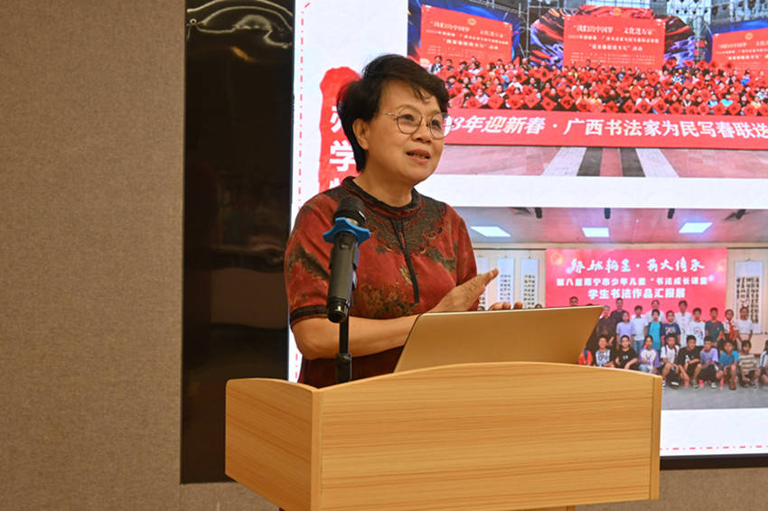 唐蓓主席在致辞中表示: 南宁市少年儿童“书法成长课堂”创办十年,成为一个知名品牌,这是最好的课堂,有最专业的老师。希望同学们珍惜此次难得的学习机会,努力学习,以优异成绩回报社会各界的爱心支持和书法家老师的无私奉献,并希望同学们从这里启航,让书法成为你们终生的兴趣和热爱。