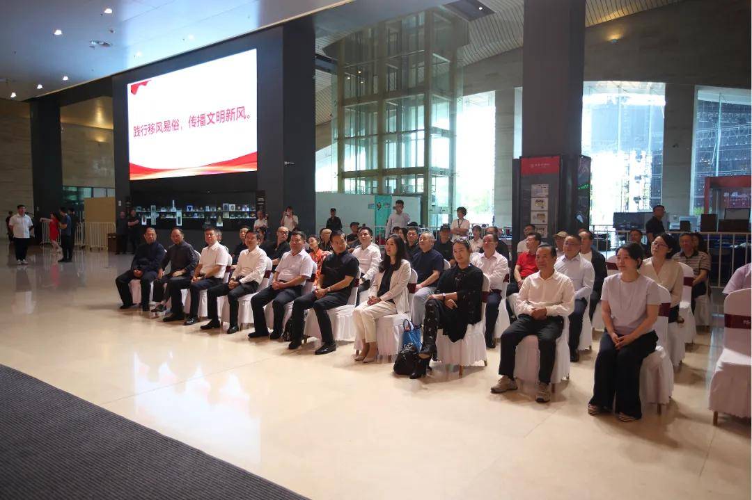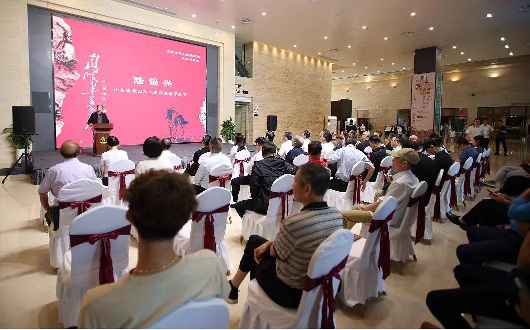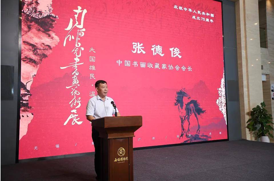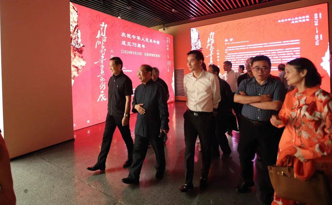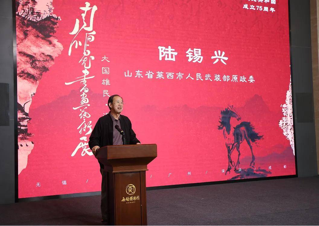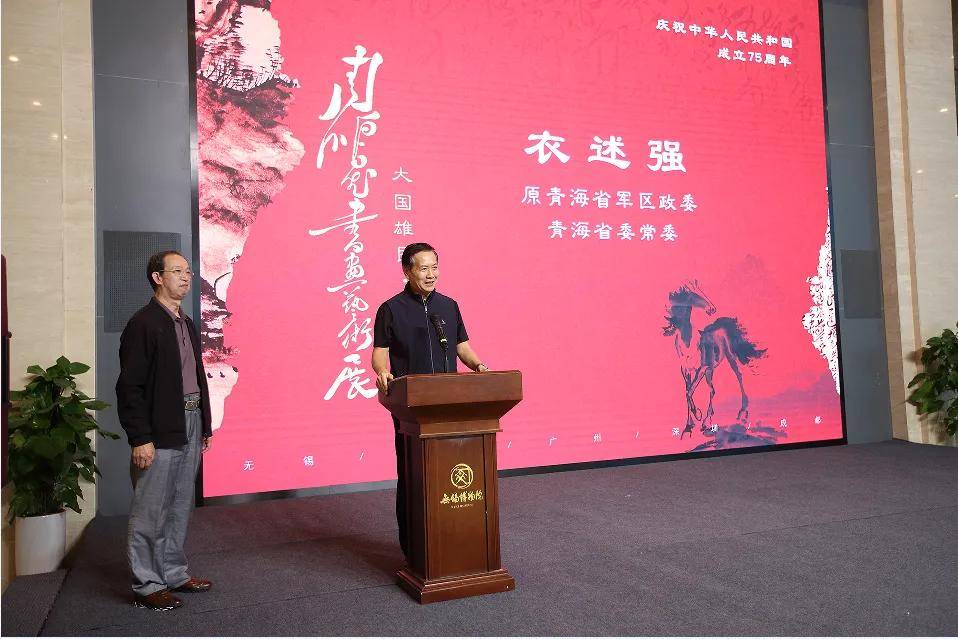 9月29日上午,“大国雄民,温文而霸——庆祝中华人民共和国成立75周年周鹏飞书画艺术展”在无锡博物馆开幕。 青海省军区原政委(常委)衣述强(少将),中国非物质文化遗产保护协会副会长马秦临,空政文工团原副团长王虹(大校),中国书画収藏家协会会长张德俊,山东省莱西市人民武装部原政委陆锡兴等出席开幕活动。