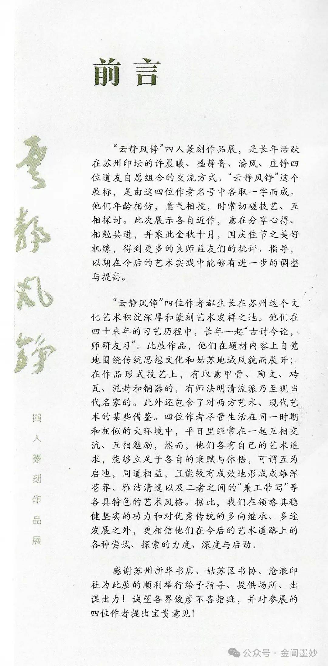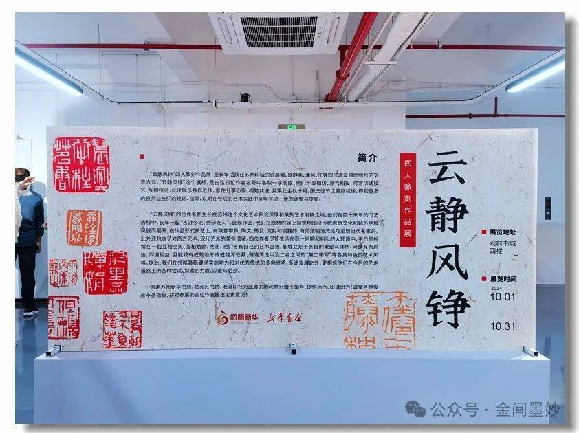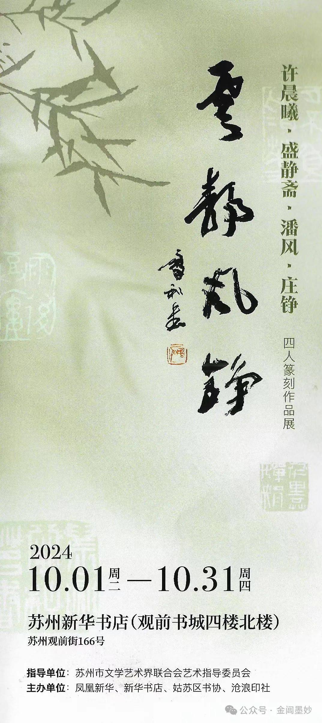 金风送爽,丹桂飘香。10月1日,“云静风铮”四人篆刻作品展,在苏州姑苏区观前街新华书店四楼拉开序幕,展期一个月。此展由苏州市文学艺术界联合会艺术指导委员会以及苏州凤凰新华、新华书店、姑苏区书协、沧浪印社指导与主办。现场共展示了四位作者80多件印蜕集成并附拓款的印屏和60多件篆刻原石作品,较为立体地展示了许晨曦、盛静斋、潘风、庄铮四位当代吴门篆刻家的篆刻与书法艺术,他们在呈现各自艺术个性的同时,也在风格多样性上继承了源远流长的吴门篆刻特有的优良传统。出席今天开幕的领导和嘉宾有:钱建中、杨鼎美、陈艺、王国安、季海跃、周国红、薛春泉、矫健、李娜、张华、汪鸣峰、沈立、朱斌生、陈益民、沈简谷、李昉、张建东、葛鸿志等,以及到现场祝贺与参观的各界人士和爱好者二百多人。 “云静风铮”四人篆刻作品展,是长年活跃在苏州印坛的许晨曦、盛静斋、潘风、庄铮四位道友自愿组合的交流方式。“云静风铮”这个展标,是由这四位作者名号中各取一字而成。他们年龄相仿,意气相投,时常切磋技艺、互相探讨。此次展示各自近作,意在分享心得、相勉共进,时值金秋十月、国庆佳节之机,得到更多良师益友们的批评、指导,期待在今后的艺术实践中能够有进一步的调整与提高。展览现场,“云静风铮”四位作者向前来观展的各界热心艺术、爱好篆刻的人士赠送了他们自己精心手工钤制的文创书签以及作品折页和篆刻集等物品。 83岁高龄的著名书画篆刻家、原东吴印社老社长周摩和老师欣然题写了展标“云静风铮”。周摩和老师因腿脚不便,没能来现场观摩,但他对四位作者都很熟悉,对他们的作品都很了解,他认为:他们四个人的篆刻作品根植于传统,同时各有自己的审美和追求,形成了独特的、鲜明的个人风格,可喜可贺。原苏州市书协副主席陈艺老师在现场看了展出的100多件佳作后说,这不仅是四位作者近期创作的成果汇展,更展示了他们继承传统和勇于探索的精神与活力。因此乘兴赋诗一首:刀尖舞动显英豪,云上清风古峻高。静思妙想方寸地,铮铮傲骨领风骚。