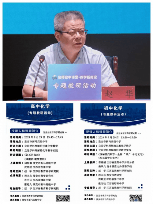 为贯彻落实新课标理念,进一步促进中学化学教师之间的交流与合作,切实提升教师的专业技能水平和教育教学能力,2024年9月29日下午,由江苏省教育科学研究院主办、淮安市教研室承办的“名师空中课堂•教学新时空”(中学化学)专题教研活动在淮安市新马高级中学顺利举行。本次活动的研讨主题是:立足学科理解的元素化合物教学。活动由江苏省教育科学研究院赵华老师主持,邀请了江苏省清江中学校长、中学正高级教师、江苏省高中化学特级教师乔中云; 淮安市新马高级中学副校长、中学化学高级教师、市首批化学学科带头人谢迎九;江苏省盱眙中学高级教师张万柱主任; 市初中化学学科研究基地组长、盱眙县第二中学化学教研室周晓芸主任等作为点评专家。