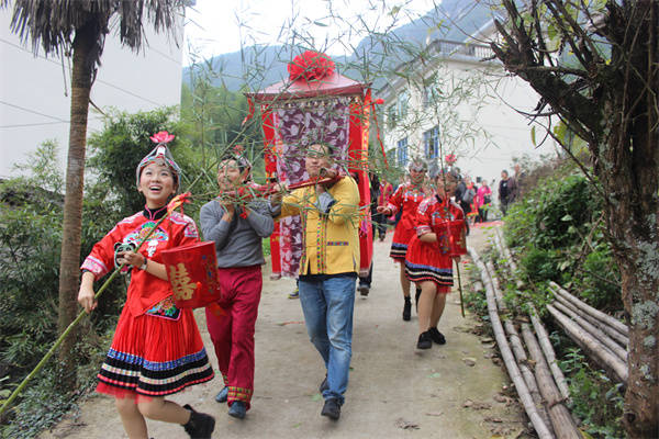 按照习俗陈建杰等人一到村里就换上了畲族服装。婚礼从双方请来的畲族歌手对歌开始进入高潮。杉树枝拦路、门闩挡门……通过对歌新郎才能通过一道道门坎进入新娘的闺房献花表爱心。