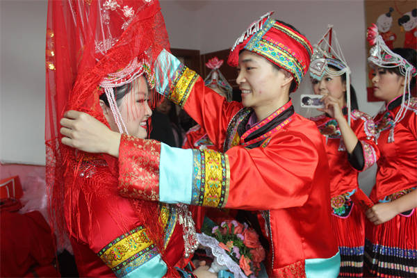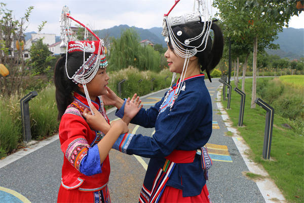 酒宴中,客人们在劝酒歌中,边品尝主人准备的佳肴,喝美酒。 以歌代言的“哭嫁”、走三步退三步的“留桥”……无不表达了新娘对娘家无限的留恋以及亲戚、小姐妹们对新娘的不舍,十足的畲乡风情扑面而来。 陈建杰说,他想过很多次自己举行婚礼时的方式,但真的没想到会进行一场这么充满民族风情的婚礼。亲戚朋友、同学都觉得他这样的婚礼别具一格,纷纷向他祝福。 新娘的母亲就是蓝伟娥,这场充满畲族文化的“婚嫁”就是她新手策划安排的。“我参加过很多次畲‘婚嫁’的表演,很多次想为什么现在现实生活中没有了结婚的‘婚嫁’形式了呢?我当年出嫁没有以畲族的习俗进行,一直感到遗憾。”蓝伟娥说,她大女儿正好要结婚了,就试着与女儿、女婿商量是否可以用畲族传统“婚嫁”的形式接亲。女儿、女婿满口答应,连说以这种形式结婚好。亲朋们听了也很支持,一些老人更是出谋划策,把当年自己出嫁时的程序经历手把手地教给蓝伟娥。今天女儿实现了她的愿望,蓝伟娥心里很是激动。 老支书钟福金说,上世纪80年代以来,村民们的生活水平越来越好,畲族元素得到了恢复和发展,象今天这样真正以畲族习俗嫁女村里近几十年来也是第一例,对畲族风情的传承有很大的促进作用。 在此之前,宣平一带仅仅把“婚嫁”用于表演,自从蓝伟娥把畲家“婚嫁”用于现实生活中后,越来越多的畲家姑娘、小伙子出嫁或娶妻的婚礼便以这种“婚嫁”的形式进行,吸引了众多的游客、附近村民前来观看。 近年来,刻苦钻研畲族头饰制作工艺,制作技艺日渐见长的蓝伟娥,积极参加各类畲族传统文化演出和非遗产品展示。同时,将目光瞄向了将畲族头饰制作工艺,用于发展乡村非遗文化产业,助力乡村文化振兴的重要部分。在2020年浙江省首届畲族文化创意产品比赛中其制作的头饰得了优秀奖。