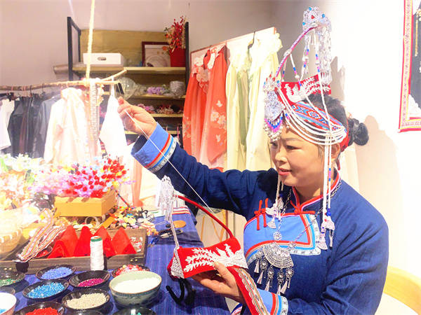蓝伟娥潜心钻研传承畲族头饰制作的事例,引起了当地文化旅游部门的关注和重视。2023年,在当地政府的大力支持下,蓝伟娥有的自己“畲小娘工作室”,从此,她更是一头钻进了畲族头饰制作的工作中,现在她一天基本能做一个完整的凤冠。随着各地旅游的兴起,她制作的畲族头饰越来越受到游客和畲族文化表演者的青睐。
