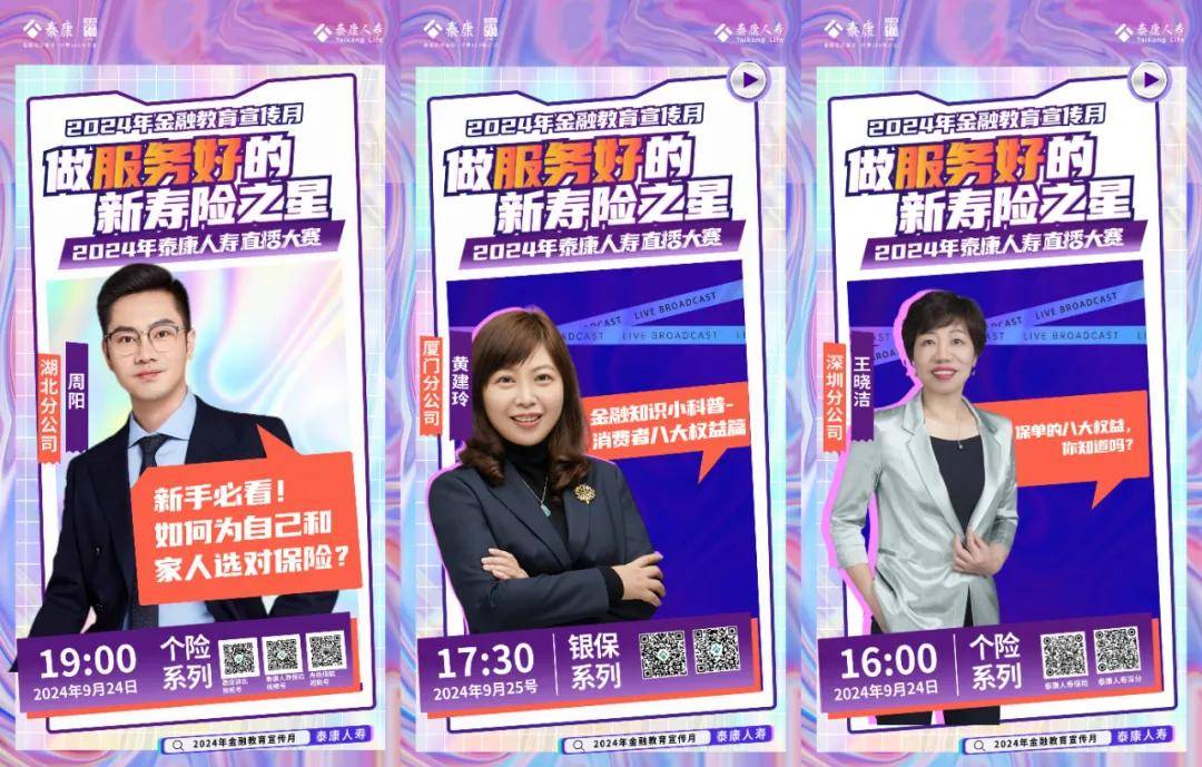 近日,全国各大金融机构在国家金融监管总局的指引下,如火如荼地开展“金融教育宣传月”活动。泰康人寿积极落实监管要求,创新线上传播方式,开展2024年泰康人寿直播大赛,创新“保险精英+直播”的宣传模式,拉近公众与金融知识的距离,践行“金融为民”,助力金融教育宣传提质增效,走深走实。 创新“保险精英+直播”线上传播方式 金融教育宣传提质增效 2024年泰康人寿直播大赛,号召全体泰康保险精英做“服务好的新寿险之星”。活动选取保险代理人作为宣传主体,一方面,发挥保险代理人贴近消费者的桥梁作用,面向人民群众开展金融教育宣传;另一方面,保险代理人作为保险从业人员,通过这次活动,更能提高诚实守信、依法合规的从业意识。此外,活动通过直播形式,突破地域空间限制,拉近保险精英与消费者的距离,更有利于金融教育宣传提质增效,扩大宣传的覆盖面和影响力。 一直以来,作为寿险行业的探索者和领先者,泰康人寿坚定打造“服务好”新寿险公司。得益于泰康坚持在支付、服务、资产三端都要落脚到“服务好”,不断丰富服务产品、提升服务品质、锻炼服务能力,保险精英们方可通过本次直播大赛,积极展现泰康作为大型民生机构,全面贯彻监管要求,践行以人民为中心价值取向的企业风尚。 直播内容推陈出新 展示“服务好的新寿险之星” 泰康人寿践行以人民为中心的价值取向,积极落实国家金融监管总局要求,直播内容普及金融消费和保险知识,提高公众风险防范意识,引导消费者结合自身需求合理运用金融工具做好财富管理等。 围绕以上直播内容,保险精英们结合实际、主动创新,开展了生动活泼、有趣又有料的直播:《如何选择适合的保险产品?》《保单的八大权益,你知道吗?》《从“影视剧”看家庭风险保障配置》《中高净值家庭的健康与财富规划》等。