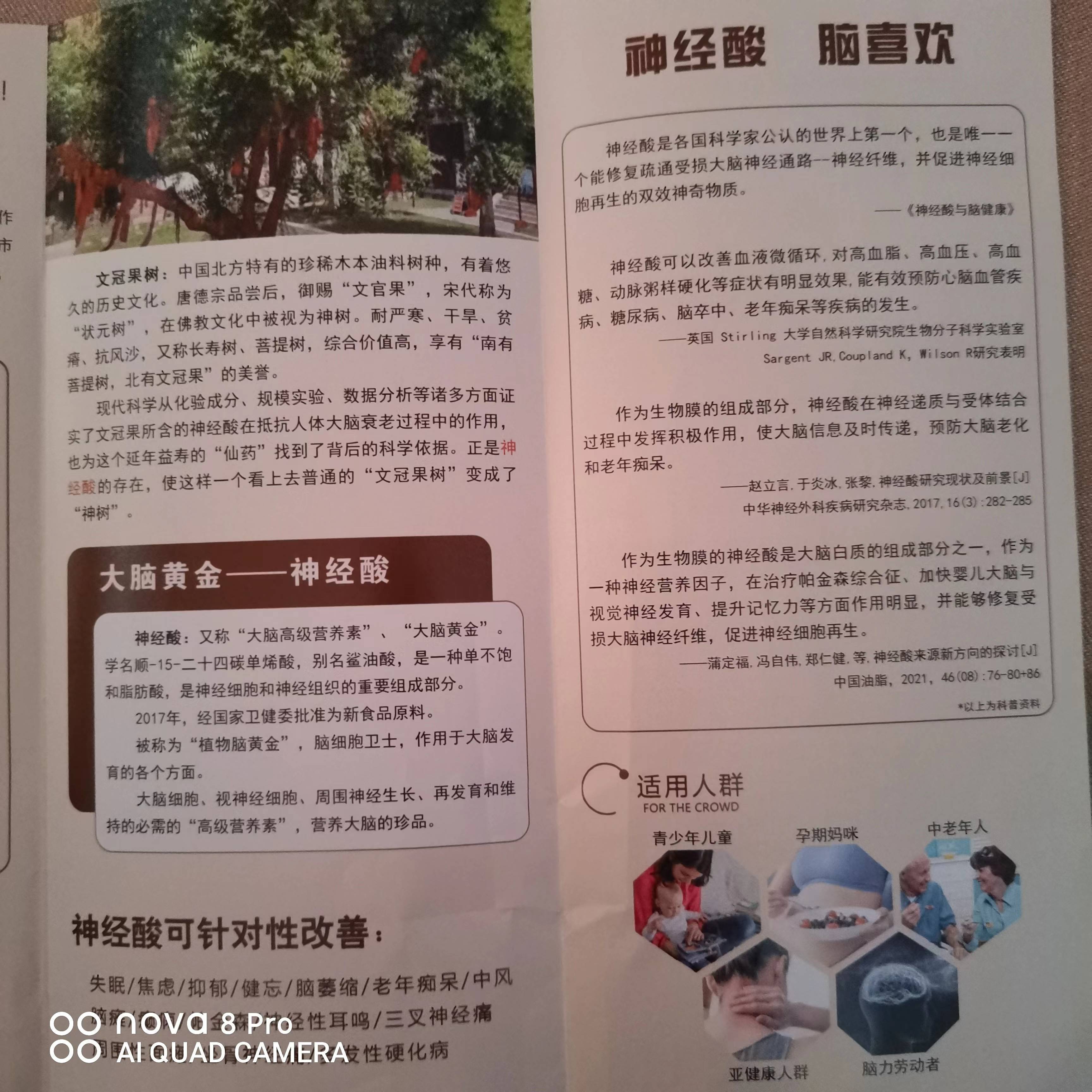 宋代称为状元树,在佛教文化中被视为神树。此树耐严寒,抗干旱风沙,又被称为长寿树,菩提树。综合价值高,享有南有菩提树,北有文冠果的美誉。文冠果中的神经酸,是大脑黄金,别名鲨油酸,是一种长链单不饱和脂肪酸,是神经细胞和神经组织的重要组成部分。 2017年,经国家卫批准为新食品原料。被称为植物脑黄金,脑细胞卫士,作用于大脑发育的各个方面。是大脑必须的高级营养素,营养大脑的珍品。 王月喜一行在著名企业家,公司董事长郭庆,市转业军人服务局闫济中局长陪同下,认真听了公司工作人员的精彩解说,并观看了视频,现场观摩了公司系列产品。