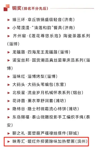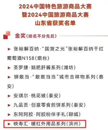 ![]() 10月13日,2024中国特色旅游商品大赛暨2024中国旅游商品大赛获奖名单公布。滨州市文化和旅游局选送的参赛商品映寿汇·暖红外用品系列荣获金奖(全省共7个),映寿汇·暖红外抑菌除味加热壁画获得铜奖。