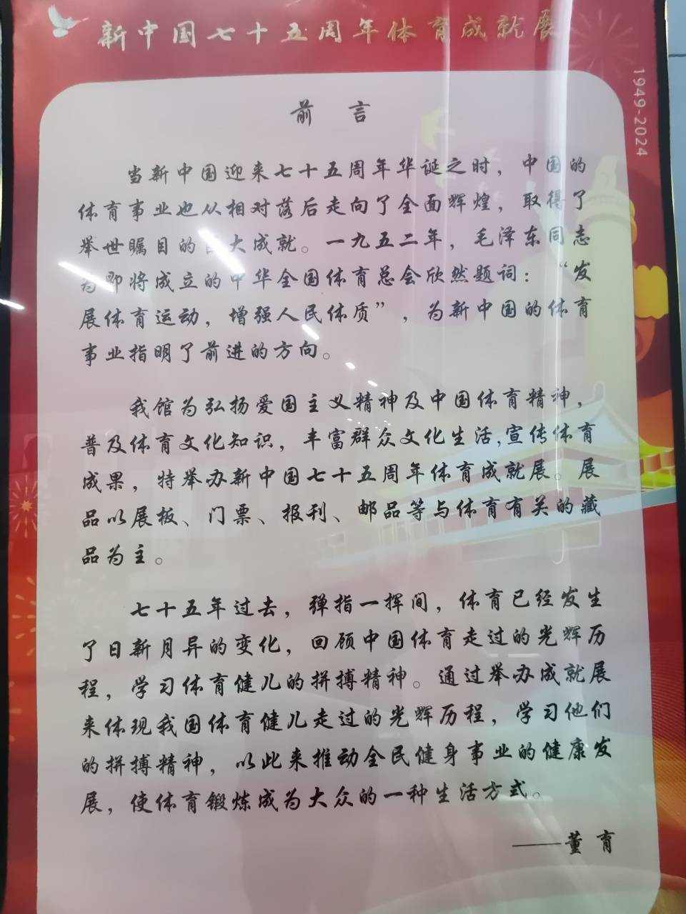 2024年10月18日,一场主题为展示新中国七十五周年体育成就的展览在北京中梦足球博物馆开展,本次展览以展板、门票、图片、邮册、球拍等实物的形式进行展出,展览由北京奥运火炬手协会和中梦足球博物馆联合主办,时间预计展至明年2月。