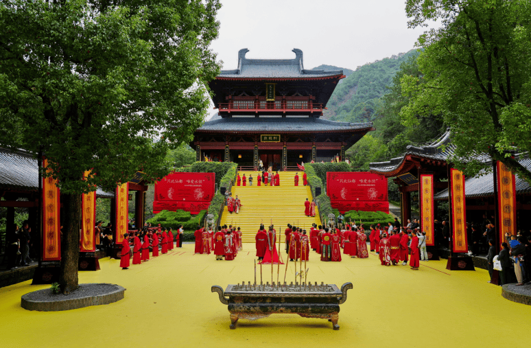 一看显示屏,进景区的门票是90元,我因为有退伍军人优待证,则可以免费进入游玩。从昨天对面的位置看鼎湖峰,孤石屹立,状如春笋,直刺云天,高大雄伟,景色亦有不同之变,有渔夫撑着小船在清澈的湖面上往返游弋,供游客拍照。 从鼎湖峰沿着台阶行走,便是黄帝祠。其前身为始建于东晋咸和年间的缙云堂,相传是黄帝三大行宫之三天子都。唐天宝七年唐玄宗李隆基敕改为黄帝祠宇,北宋治平年间救改为玉虚宫,宋元时期达到鼎盛,拥有建筑24座,清顺治年间毁于兵燹。1998年重新建成,有宫门、轩辕殿、缙云堂、怀祖堂、腾龙阁、游龙轩等,建筑面积5700平米。黄帝祠宇结构上由三重院落组成,呈梯状由低到⾼分布,与陕西黄帝陵遥相呼应,形成“北陵南祠”格局,是中国南方黄帝祭祀中心和黄帝文化辐射中心。每年清明节、重阳节举行的缙云轩辕祭典是国家级非物质文化遗产。《汉武大帝》《天龙八部(张纪中版)》《狄仁杰之通天帝国》《笑傲江湖》《少年神探狄仁杰》《花千骨》《青丘狐传说》《新神雕侠侣》等影视剧在此拍摄。当天正好有一个集体婚礼在黄帝祠举行,27对新人身着唐代风格婚服,在仙都黄帝祠宇许下白头之约,吸引了众多的游客围观,给我们的行程增添了一道文化气息浓厚的景观。