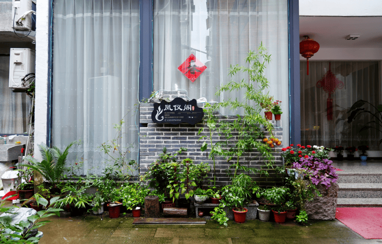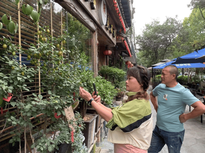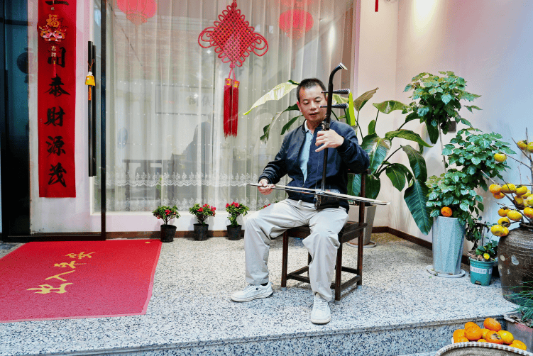 穿过一条短小的小巷来到预订的凤仪阁民宿,老板刘家鸣正坐在门口沉浸式地拉着二胡,边上随地放着一些红黄色的柿子。我们几下“咔嚓、咔嚓”的拍照声把他惊醒。刘家鸣热情地迎接着我们,一边给我们办理入住手续,一边叫我们坐下来先喝杯茶。