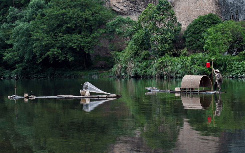 “来了!来了!牛上桥了!”只见一农夫头戴苙帽,身边一袭蓑衣,牵着一头小黄牛缓缓地走上丁板桥,后面跟着一位农妇,挑着一担菜。游客纷纷举着相机、手机拍照、摄影,惊喜地发朋友圈。 边上有游客介绍,这头牛是有“编制”的,有工资发。几年前,一个姑娘在这里游玩,觉得一座桥、一溪水、一座鼎湖峰总觉得缺少点什么。于是她请来附近一位正在耕田的老农,叫他牵着牛在桥上走一走,一下子一个简朴而充满农村生活气息的场景扑面而来。据说照片一露世,就引起了轰动,吸引了众多的摄影爱好者和游客,这个位置也就成了“网红打卡”点。现在的“老汉牵牛”成了景区保留的节目,每天上午9点30分、下午2点钟各表演一次。