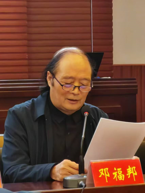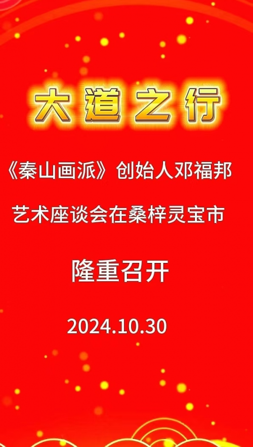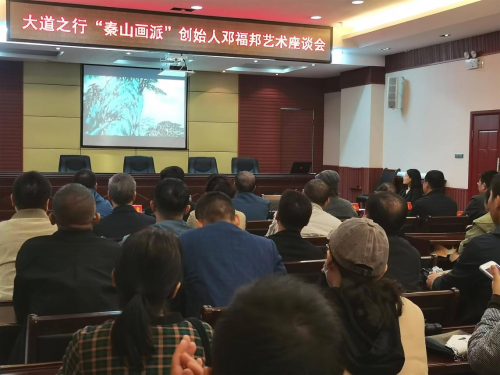 大道之行《秦山画派》创始人邓福邦艺术座谈会在桑梓灵宝市隆重举行 十月是一个金色的季节,当银杏黄叶与初红的枫叶相交溶时,一派五斑斓的锦锻便映罩在神奇的大秦山脚下! 在将跨进十一月份的前两天(十月三十号)由灵宝市委、市政府宣传部、灵宝市文联在文旅大厦为弘农游子在京研学的中国书画大家邓福邦先生及夫人书法家张云霞举行了大道之行“秦山画派”创作艺术座谈会。文联党组书记、主席伍丹主持会议,副主席李辉向参会的专家学者、灵宝市美术家协会、灵宝市书法家协会相关人员及艺术同道介绍了邓福邦先生在京的基本概况和创作现况。观看了《大道之行一邓福邦秦山艺术探巡录》纪录片。