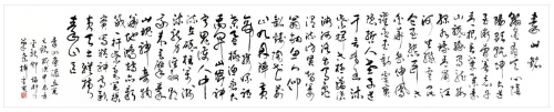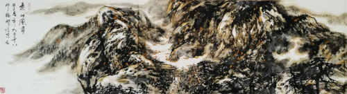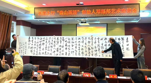 邓先生就座谈会做了“根植弘农沃土、情缘灵宝桑梓“秦山画派以故土深厚文化底蕴为基准,倾力锻造文化金字招牌创作为时代放歌、为人民代言的高质量艺术作品报告发言。邓先生道:灵宝是我的家乡,一块神奇的地方,她与我有着梦牵魂绕的情缘。她既是老子在千古名关《函谷关》著述道德经的地方。又是迄今为止发掘《轩辕黄帝铸鼎原碑铭并序》现存最早的记载有黄帝铸鼎内容的碑刻之地。黄帝文化、黄河文化、秦山文化、老子文化、仰韶文化等交相辉映,为这方热土增添了无尽的神秘色彩。做为灵宝儿女的邓福邦更有责任和义务用画笔去描绘背依的大秦山。邓先生现身说法以大道的阴阳互动、五行转换的自然之道破解中国书画其中的密码。又以随类赋彩的四时变化演义中国书画的人文精神情感。用大气磅礴、刀砍斧劈的老辣皴法去塑造大秦山的独特地域精神风貌。经过三十多年不懈的追求和探索,做为亦书亦友的伉俪书画大家邓福邦张云霞夫妇愿将自己积累的书画经验分享于家乡同道,並向市政府宣传部、文联捐赠了巨幅书画作品。六米有余的草书“秦山铭”、“文赋秦山”、“一架天梯跃汉山”、及邓先生多年出版发表的各种版本邓福邦秦山艺术画册和著作。这份充满浓浓乡土情结的举动和发言受到灵宝书画同道的一致好评。並得到灵宝市委常委、副市长、宣传部长杜继英的高度赞赏。他号召大家学习邓福邦、张云霞夫妇以艺术为天职用精湛艺术去描绘我们日新月异的伟大时代和家乡变化风貌。多出精品,不负韶华,做一个既有社会责任又有过硬技艺的人民艺术家。