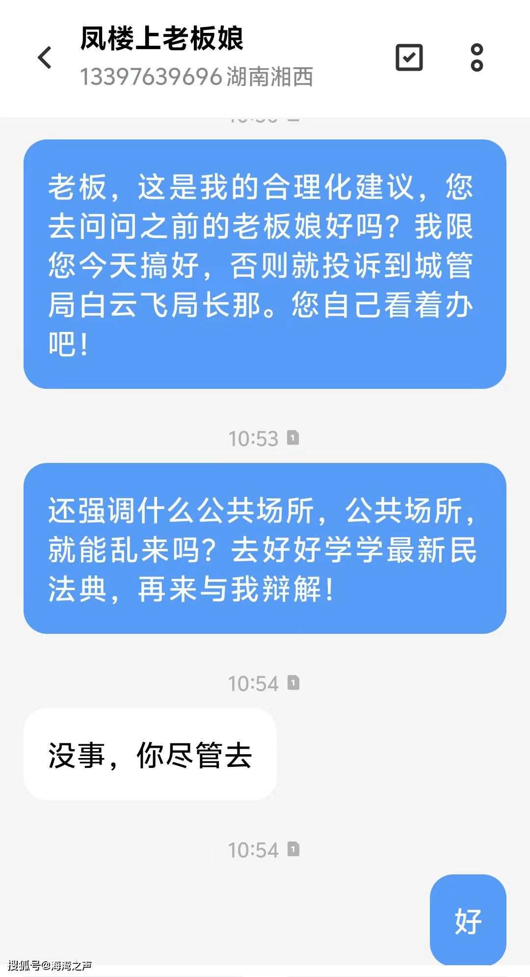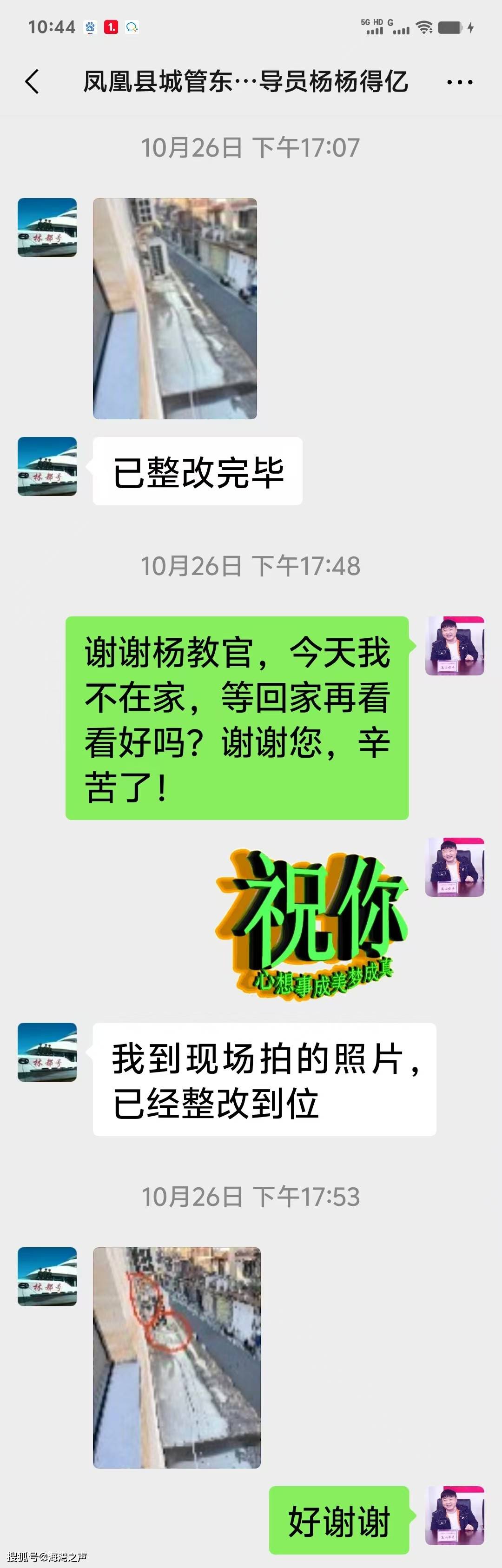 湖南·湘西凤凰县城管执法局在县委县政府领导下,为了给国内外游客打造良好的旅游环境与秩序,更好的巩固“5A”景区创建成果,凤凰县城管执法局在白开文局长等领导带领下,自国庆来,全体城管队员夜以继日的分别坚守在自己的工作岗位上。因我高山旗手已退休多年,大部分时间都常住凤凰古城,平时出去买菜、散步都亲眼看见他们在每个路段、路口、定点、定位专人值守,对游客的每项咨询与诉求都是细心耐心,尤其是对流动摊贩、车辆乱停乱放等现象都是人性化管理,和蔼可亲的劝导解释,对极个别屡教不改的,才适当给予处罚。用实际行动维护了“城管蓝”“中国红”的光辉形象,真正体现了人民至上。 现在县城的城管工作,不但采取人巡+车巡、定点巡查+机动巡查等方式,而且还采取了精细化管理,全面保洁,让“高颜值”牵手“高品质”,县城管局还启用了无人机进行定点巡航,针对卫生死角与视觉盲区开展全方位监管,开启“人工+智能”的城市治理现代化模式。按照“一名保洁员,一节垃圾箱,一台环卫车”的“三个一”模式开展城区精细化保洁,安排保洁员在城区垃圾量大的点位定点值守,延时保洁。全面清洗灯柱、栏杆、果皮箱等所有公共设施,全面冲洗人行道、青石板等路面,增加环卫车辆洒水降尘、垃圾收转运频次,在诸多细微处,彰显了城市管理高品位新亮点。 县城管局始终坚持“管理不断档,市容秩序不反弹、标准不降低”的原则,并通过宣传教育与依法查处相结合,对群众的违规行为,进行现场纠正,教育引导群众遵守城市管理规定,规范市容秩序及县城各居民小区治理整改工作。譬如上月23日,我楼上的宾馆老板的空调水一直滴在我停车位的车头上,我亲自上门告诉他,他当时态度挺好答应明天解决,可到了第二天(24号)我再去找他,人不在,我就电话联系他,话还没说完就挂了我电话,于是我就发短信给他,以下是短信具体内容截图:
