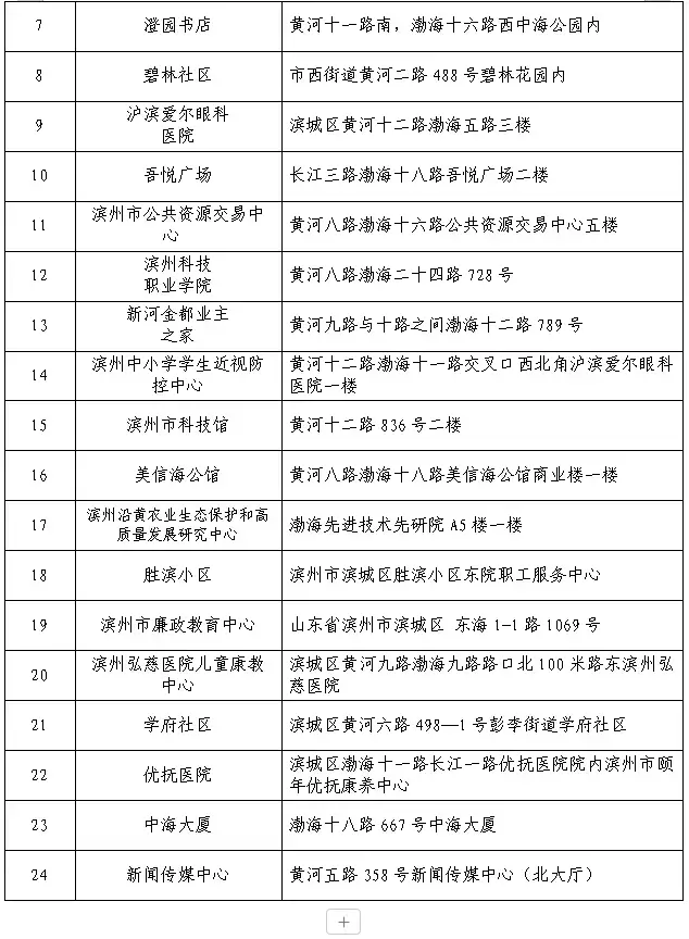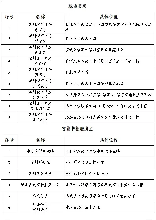 ![]() 【滨州城市书房·秦皇河馆】 地址:滨州市长江五路(秦皇河湿地公园科普宣教中心) ![]() ![]() 新增7处智能书柜服务点分布如下: 1.胜滨小区智能书柜服务点 ![]() 2.滨州市廉政教育中心智能书柜服务点 ![]() 3.滨州弘慈医院儿童康教中心智能书柜服务点 ![]() 4.学府社区智能书柜服务点 ![]() 5.优抚医院智能书柜服务点 ![]() 6.中海大厦智能书柜服务点 ![]() 7.新闻传媒中心智能书柜服务点 ![]()