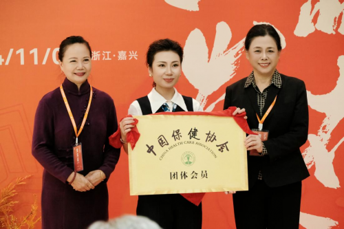 中国保健协会科普教育分会新闻顾问陈凤玲(左一)、摩天轮智美〈浙江〉科技发展有限公司董事长瞿承霞(中间)、中国保健协会科普教育分会会长于菁(右一)三人合影