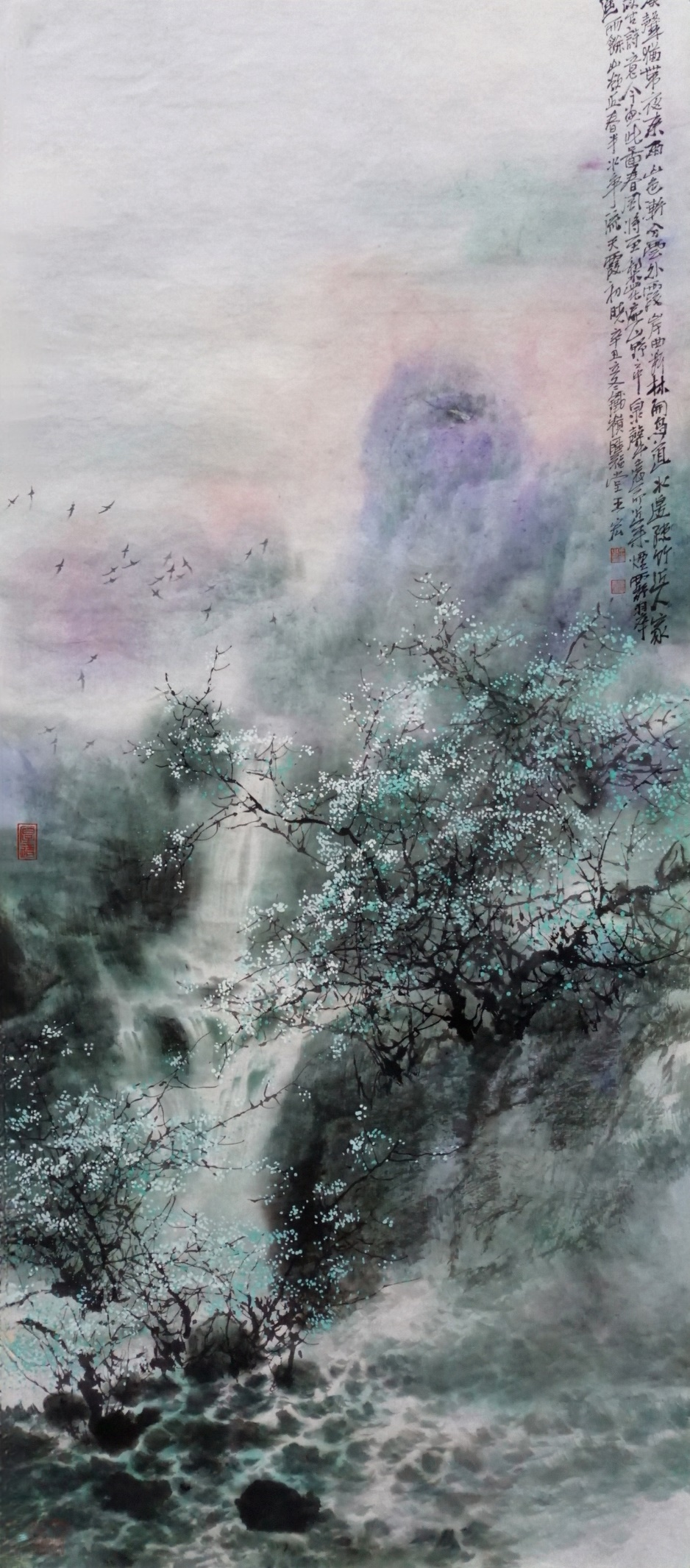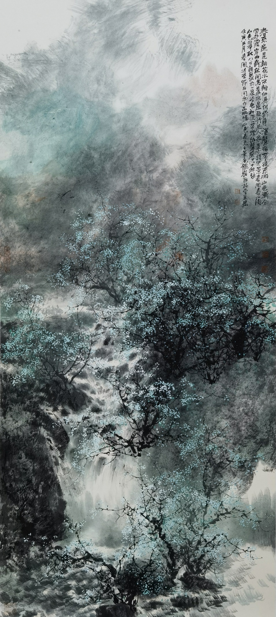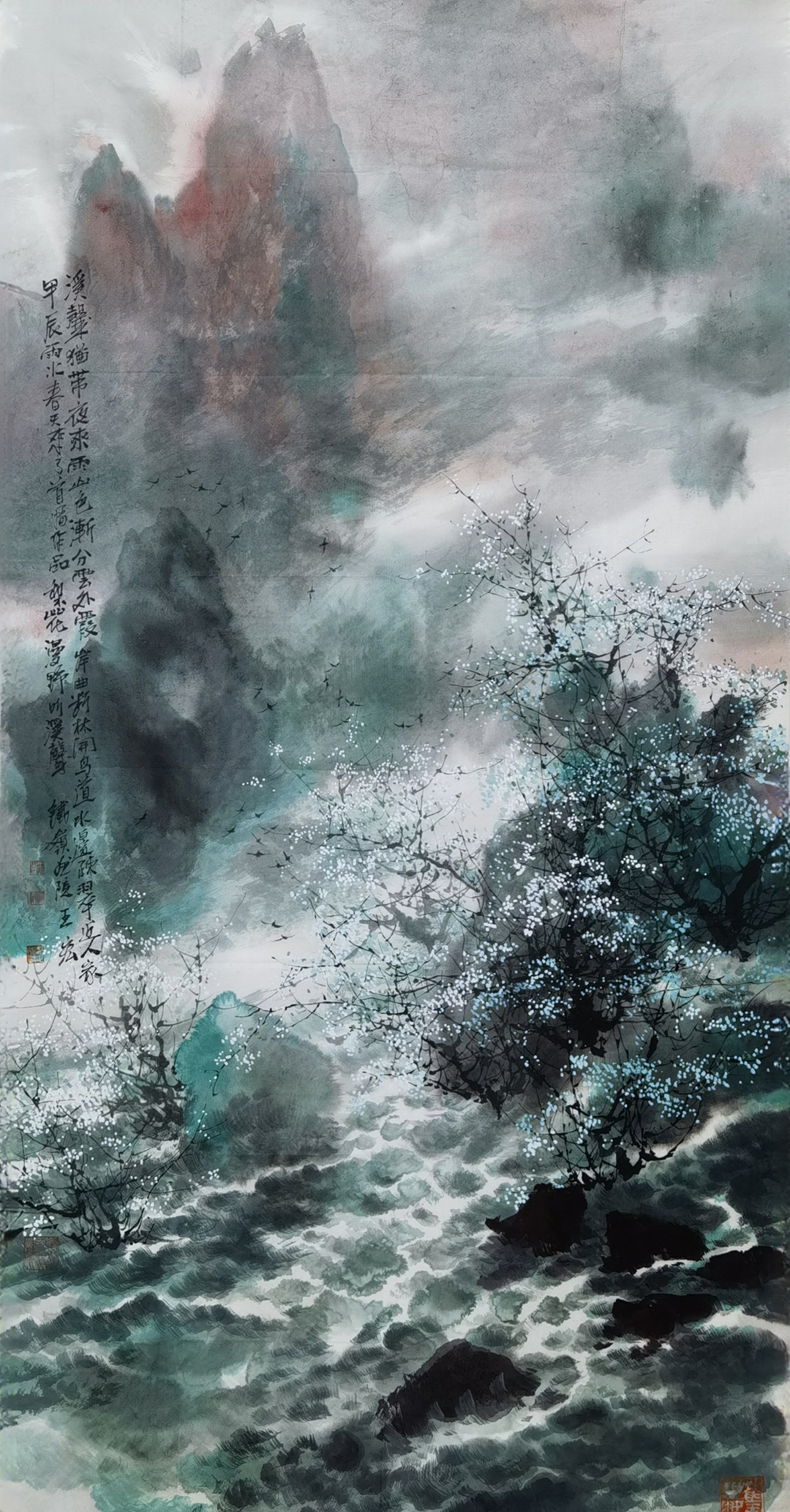 春天的信息,全新的起点、崭新的希望。让我不禁联想到,在这样的梨花雨季,不知有多少人许下誓言,以为青春可以永恒,以为信念能够超越一切。然而,岁月如梭,那些美好的瞬间终究成了记忆中的片段,只留下这满树的梨花,年复一年,静静地绽放,静静地等待,仿佛在诉说着不变的承诺与守候。 雨渐渐停了,阳光透过云层,洒在湿润的地面上,一股淡淡的清香和着雨丝,迎面飘来,梨花一枝春带雨, 花丛深处锁芳香。不仅是自然之美的展现,更是心灵深处那份不易察觉的坚韧与温柔。一路匆匆而去。“满目山河空念远,落花风雨更伤春。” ![]() 《春伴水争流》60×240cm 2022年