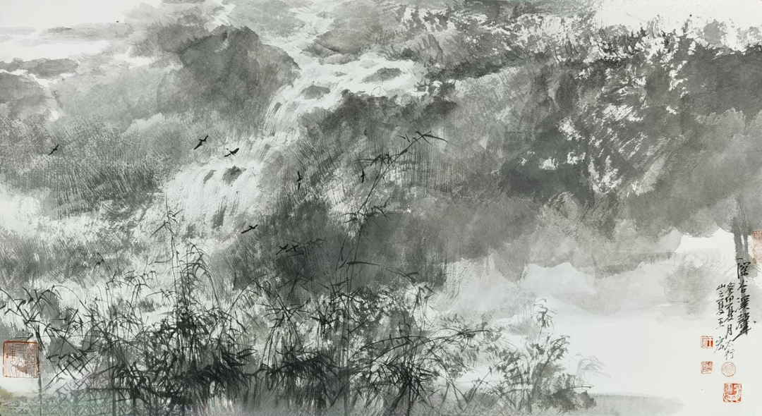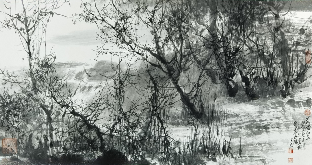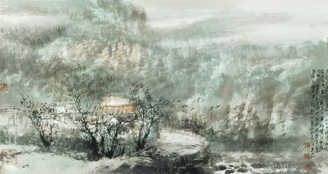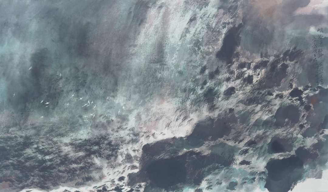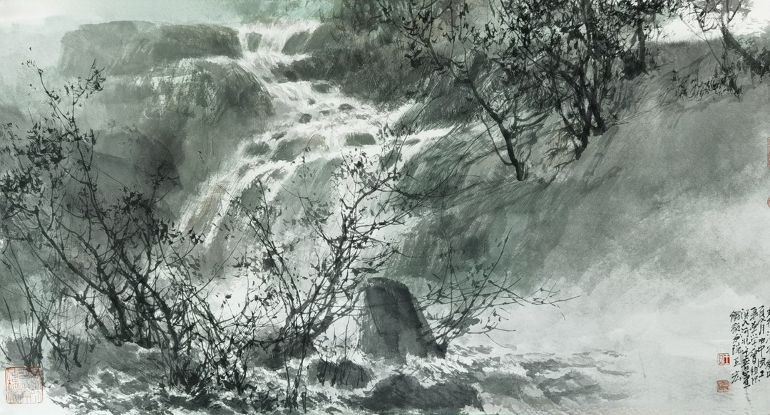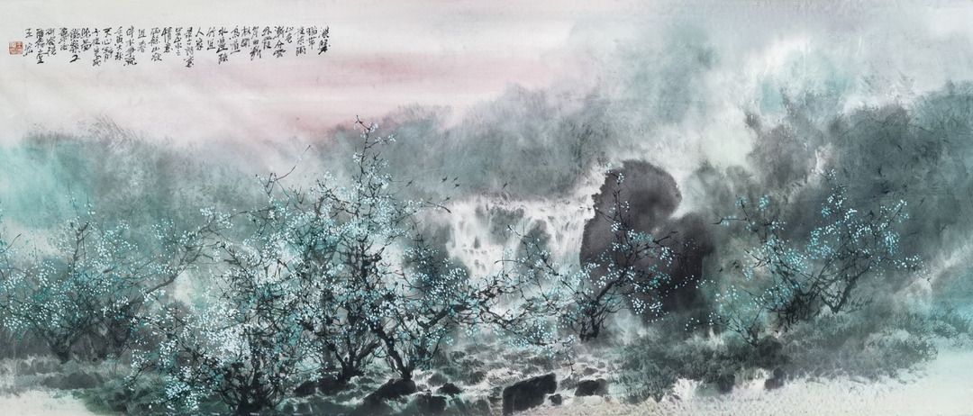 春天的信息,全新的起点、崭新的希望。让我不禁联想到,在这样的梨花雨季,不知有多少人许下誓言,以为青春可以永恒,以为信念能够超越一切。然而,岁月如梭,那些美好的瞬间终究成了记忆中的片段,只留下这满树的梨花,年复一年,静静地绽放,静静地等待,仿佛在诉说着不变的承诺与守候。 雨渐渐停了,阳光透过云层,洒在湿润的地面上,一股淡淡的清香和着雨丝,迎面飘来,梨花一枝春带雨, 花丛深处锁芳香。不仅是自然之美的展现,更是心灵深处那份不易察觉的坚韧与温柔。一路匆匆而去。“满目山河空念远,落花风雨更伤春。” ![]() 《春伴水争流》60×240cm 2022年
