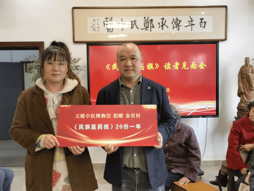 11月19 日在《民族医药报》编辑部一行人赴天姥中医博馆参观交流,在与该报读者的见面会上,新昌县肿瘤康复协会的会员早早赶来,临近村的村民也闻讯前来参会,把不大的会议室挤得滿滿的。该报总编辑吴小红及该馆馆长郑黎明都作了热情漾溢的发言,就中医药的传承和传播的途径、重点及该关注问题,展开了交流与探讨。随后,作为读者代表,杨树山、陈正华等也先后发言,谈了对百年郑氏中医的传承,对民族医药报的传播,表示由衷的赞赏,并寄于深切的厚望。接着,吴总编向郑馆长颁发了《民族医药报》读者基地牌匾;郑馆长也为参会的肿瘤康复协会会员及临近村村民,每人订阅一年的《民族医药报》,根据各人留下的地址直接及时邮寄到家。