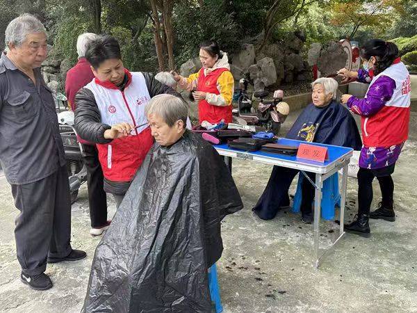 在理发服务专区,三位理发师志愿者叶慧芬、张静和平亚珍全身心地投入到为居民理发的工作中。她们提前到达活动现场,早早地开始忙碌起来,前来理发的居民络绎不绝,让她们应接不暇。据悉,家住凤山街道蜀山村的张静为了能准时参加活动,早上七点半就骑着电瓶车出发,历经 40 分钟的路程,却丝毫没有影响她为居民服务的热情。她一边理发,一边耐心询问居民的需求,极为用心。“参加公益活动很久了,理发也有好些年头,所以对居民的需求比较了解,居民一说,我基本就知道他们想要什么发型,整个过程很顺利。”