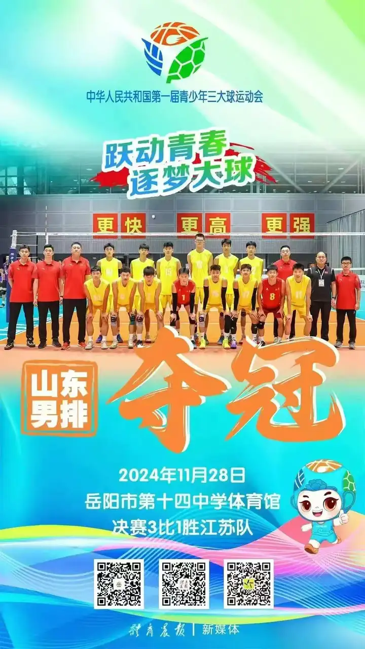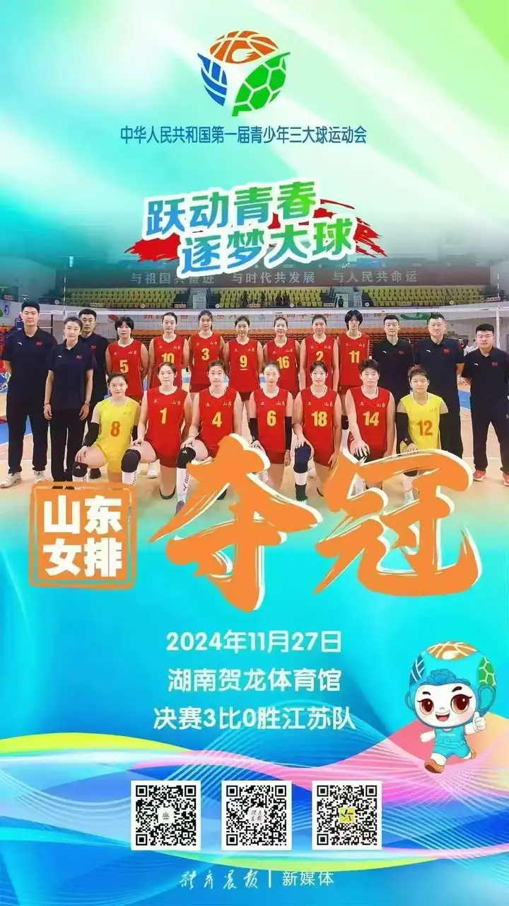 由国家体育总局、教育部主办,湖南省人民政府承办的全国首届青少年三大球运动会,于11月20-11月28日在湖南省长沙市、岳阳市成功举行。山东省足球、篮球、排球项目有6支队伍136名运动员参赛,其中潍坊市体育运动学校培养输送的运动员22名,表现突出,助力山东队获得女排、男排、男足冠军,男篮、女足亚军的优异成绩。 ![]() 男排冠军