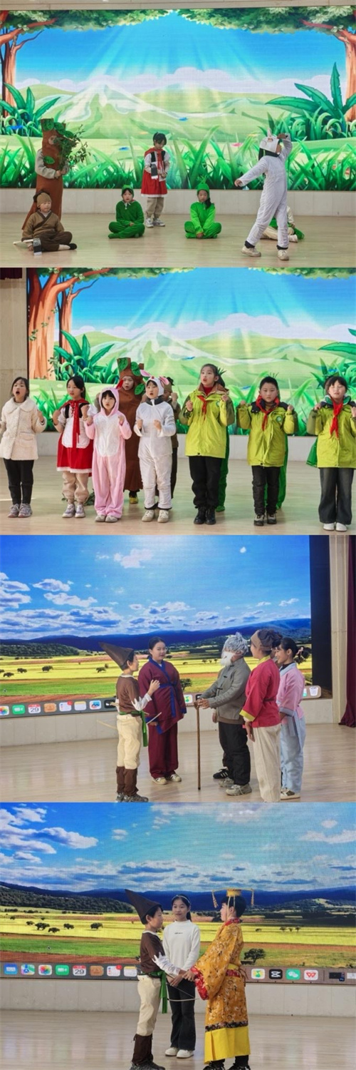 决赛现场气氛热烈,参赛的剧目丰富多彩,包括《亡羊补牢》、《老村长》、《猎人海力布》以及《守株待兔》等经典故事。学生们身着精美的服装,化着生动的妆容,全情投入到表演中。他们用生动的语言、丰富的表情和传神的动作,将一个个经典故事演绎得淋漓尽致,赢得了现场同学们的阵阵掌声和喝彩声。
