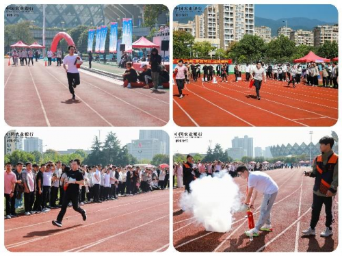 在“争分夺秒”比赛中,运动员们接力传递,与时间赛跑,快速扑灭“火险”,在游戏中加强安全意识。