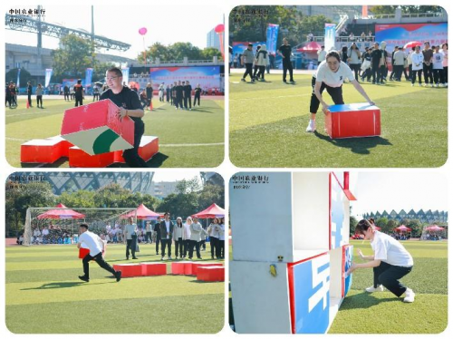 在“争分夺秒”比赛中,运动员们接力传递,与时间赛跑,快速扑灭“火险”,在游戏中加强安全意识。