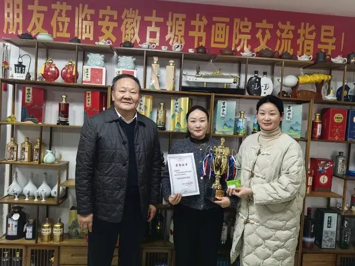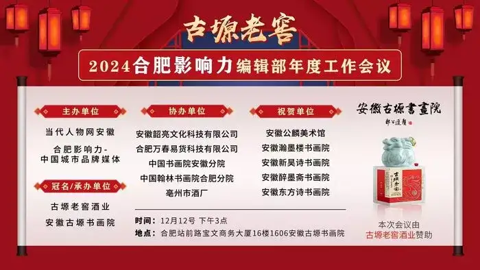 12月12日下午,合肥站前路宝文商务大厦16楼1606室,安徽古塬书画院内,一场盛大的年度工作会议暨颁奖仪式在“古塬老窖”的冠名支持下,正式启幕。此次会议由当代人物网安徽站、合肥影响力-中国城市品牌媒体联合主办,古塬老窖酒业倾情赞助,并由安徽古塬书画院精心承办。同时,安徽韶亮文化科技有限公司、合肥万春易货科技有限公司、中国翰林书画院合肥分院、亳州市酒厂等多家单位给予了有力协办。