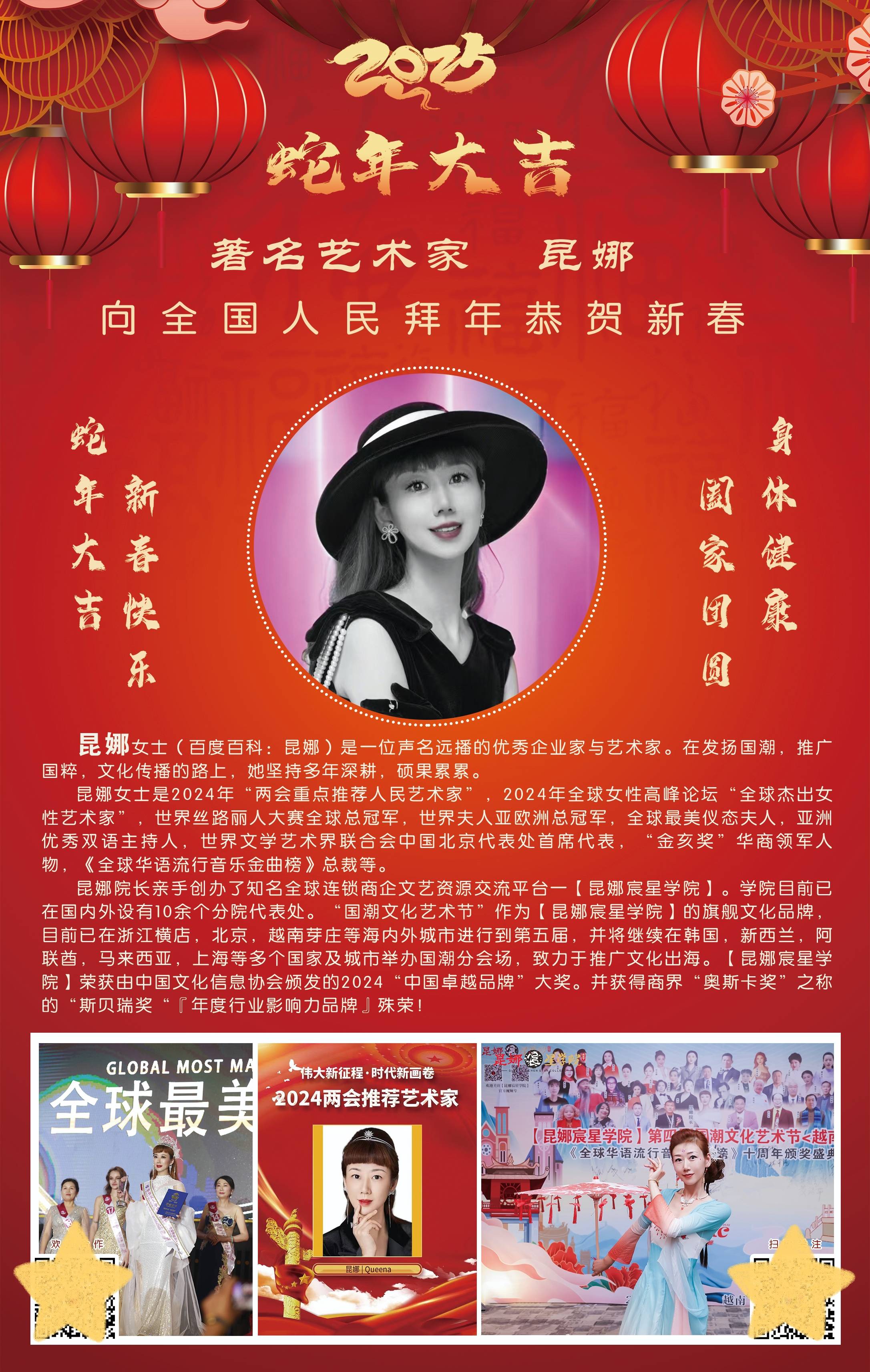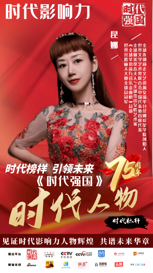 昆娜女士,现任知名全球连锁商企文艺资源交流平台——【昆娜宸星学院】院长,《昆娜名人访谈》栏目主持人,“国潮文化艺术节”品牌创始人兼组委会主席。