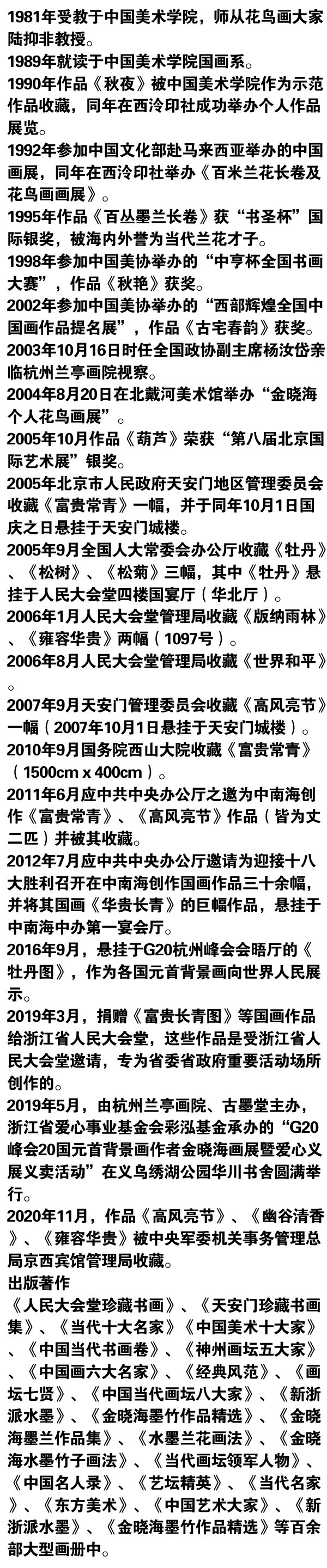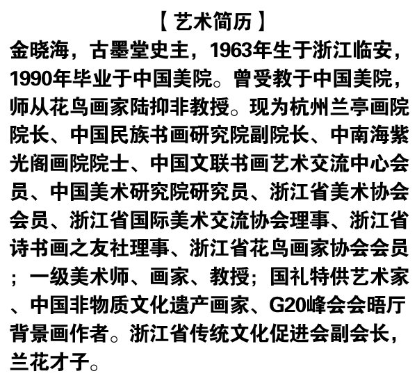摘要:【艺术简历】 金晓海,古墨堂史主,1963年生于浙江临安,1990年毕业于中国美院。曾受教于中国美院,师从花鸟画家陆抑非教授。现为杭州兰亭画院院长、中国民族书画研究院副院长、中南海紫光阁画院院士、中国文联书画艺术交流中心会员、中国美术研究院研究员、