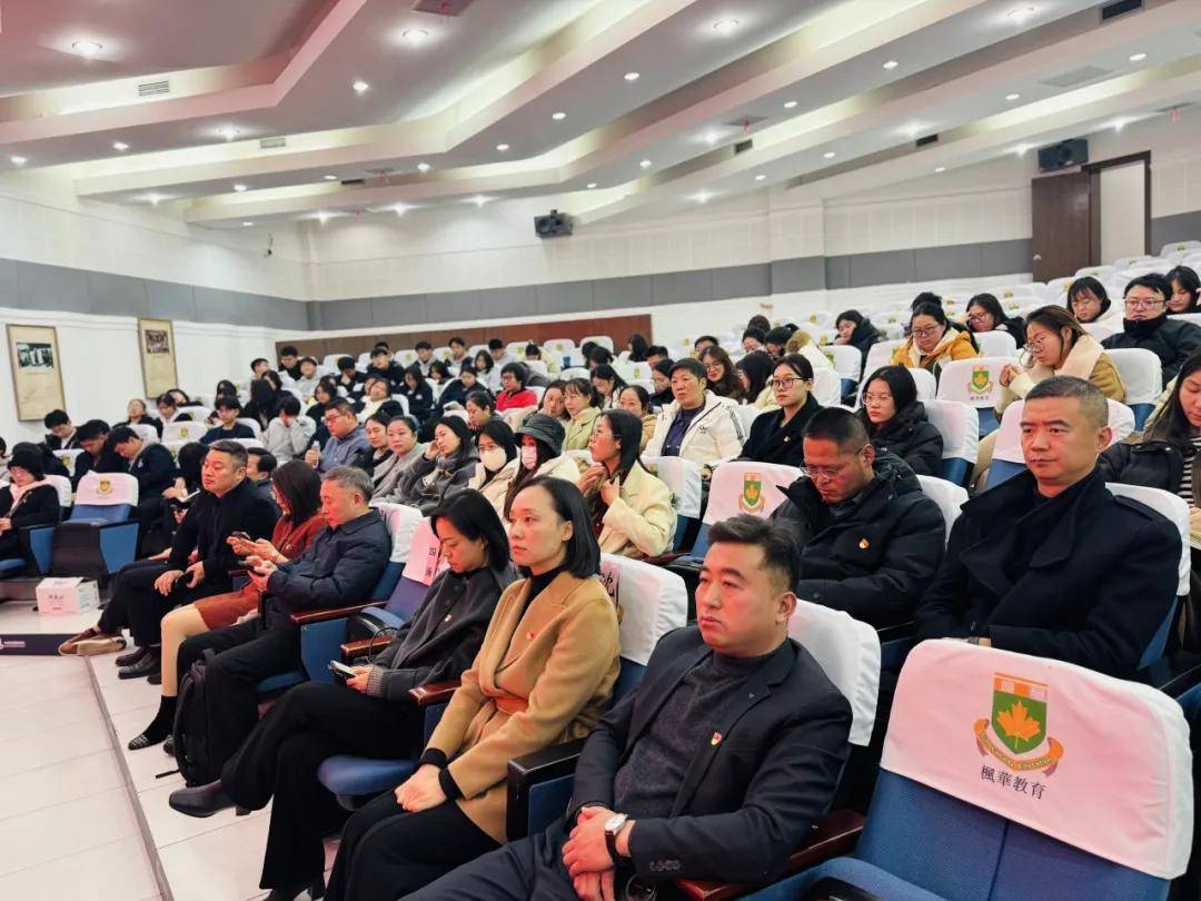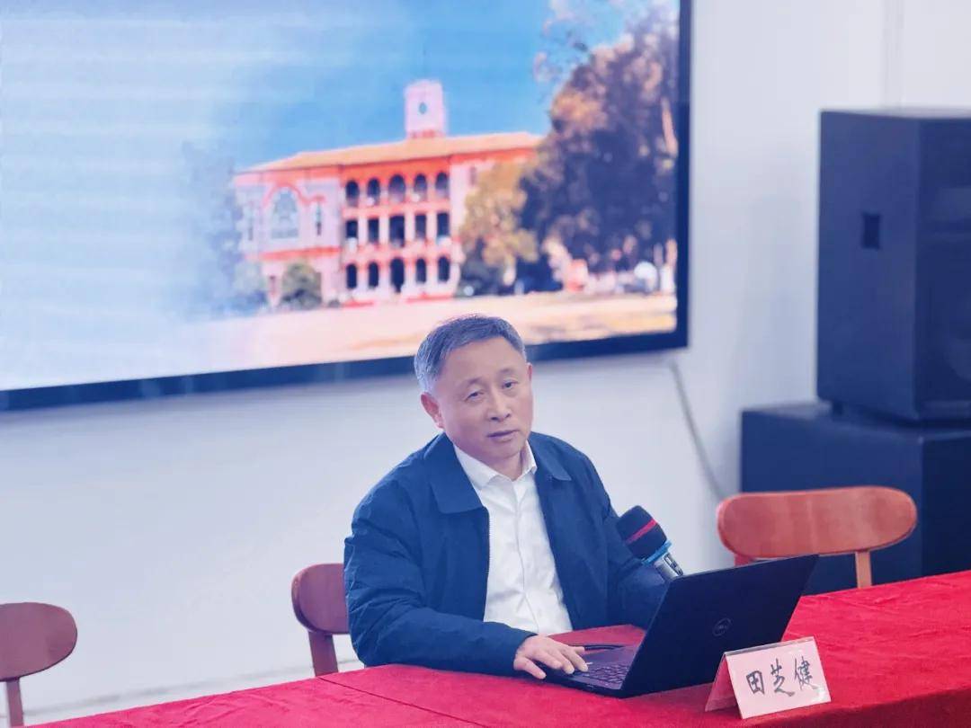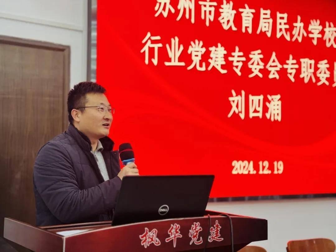 苏州市民办学校行业党建专委会专职委员刘四涌 苏州市民办学校行业党建专委会专职委员刘四涌希望,五方党组织通过联建共建,发挥学校、社业党组织的优势,促进党建成果最大化、人才培育成果最大化和实践成果最大化,并从贯彻党的教育方针、加强思想政治课、探索党建新的工作路径和方法等方面提出了新要求。 教授讲座 仪式结束后,苏州大学马克思主义学院教授、博士生导师田芝健开启党建共建的第一次活动,他以“党建引领 激发新质生产力”为题,为党员同志及枫华普高部南通班的同学们带来一堂高质量的党课。