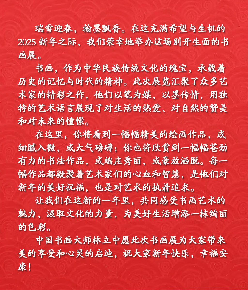 内容 在中国书画的浩瀚星空中,林立中无疑是一颗璀璨的明星。他不仅是一位融诗、书、画、印于一炉的艺术翘楚,更是一位具有深厚艺术思想和时代意义的中国书画大家。他的艺术成就卓越,影响深远,赢得了海内外无数书画艺术爱好者的敬仰与追捧。