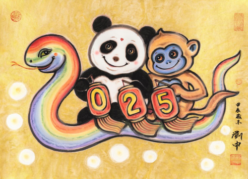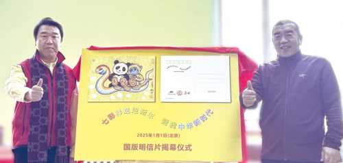 活动开始后,首先由刘中、丛志军等嘉宾共同为国版明信片揭幕。该明信片图案由刘中本人亲自设计并绘制。画面中,憨态可掬的“熊猫中中”与活泼灵动的“金丝猴华华”俏皮地骑在七彩祥蛇身上,手中提着灯笼,灯笼上“025”的数字清晰可见。蛇身蜿蜒曲折,蛇头更是巧妙地形成“2”字,与灯笼上的数字巧妙地构成“2025”的字样,生动且直观地呼应了2025新年主题。