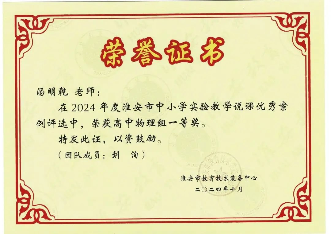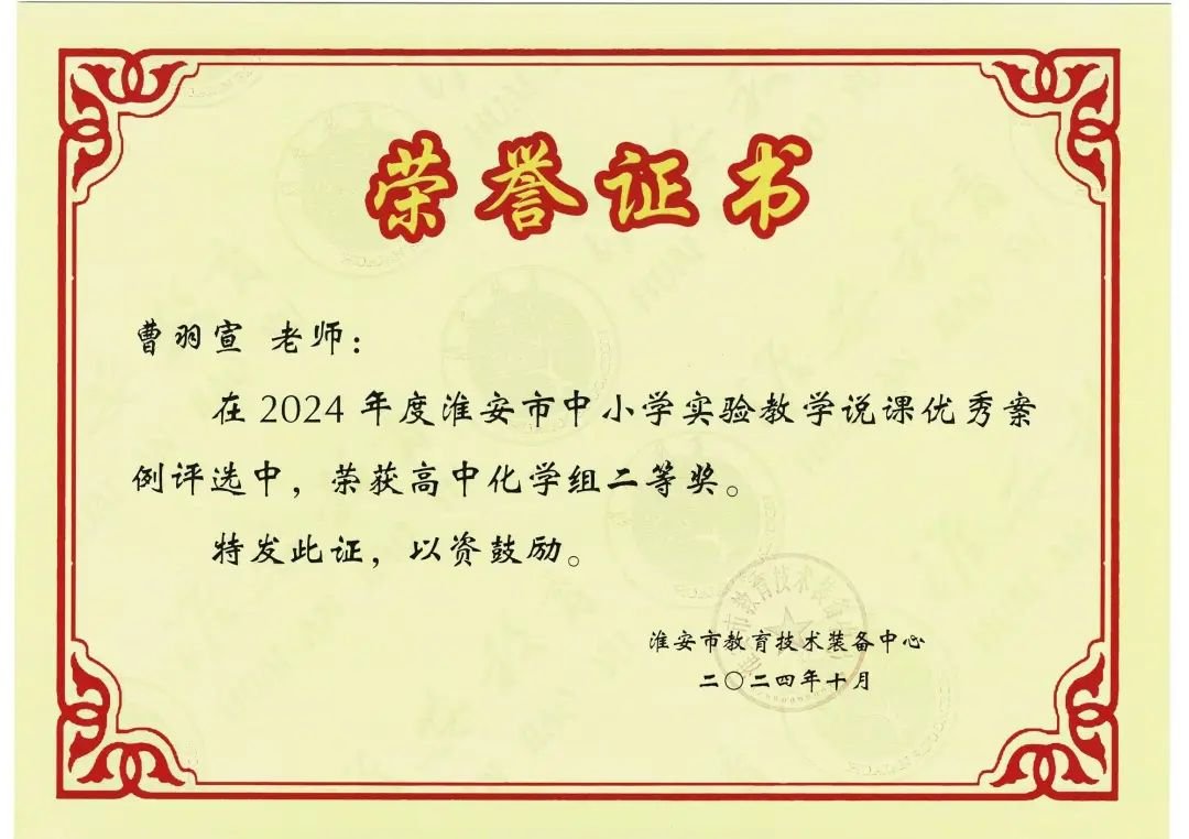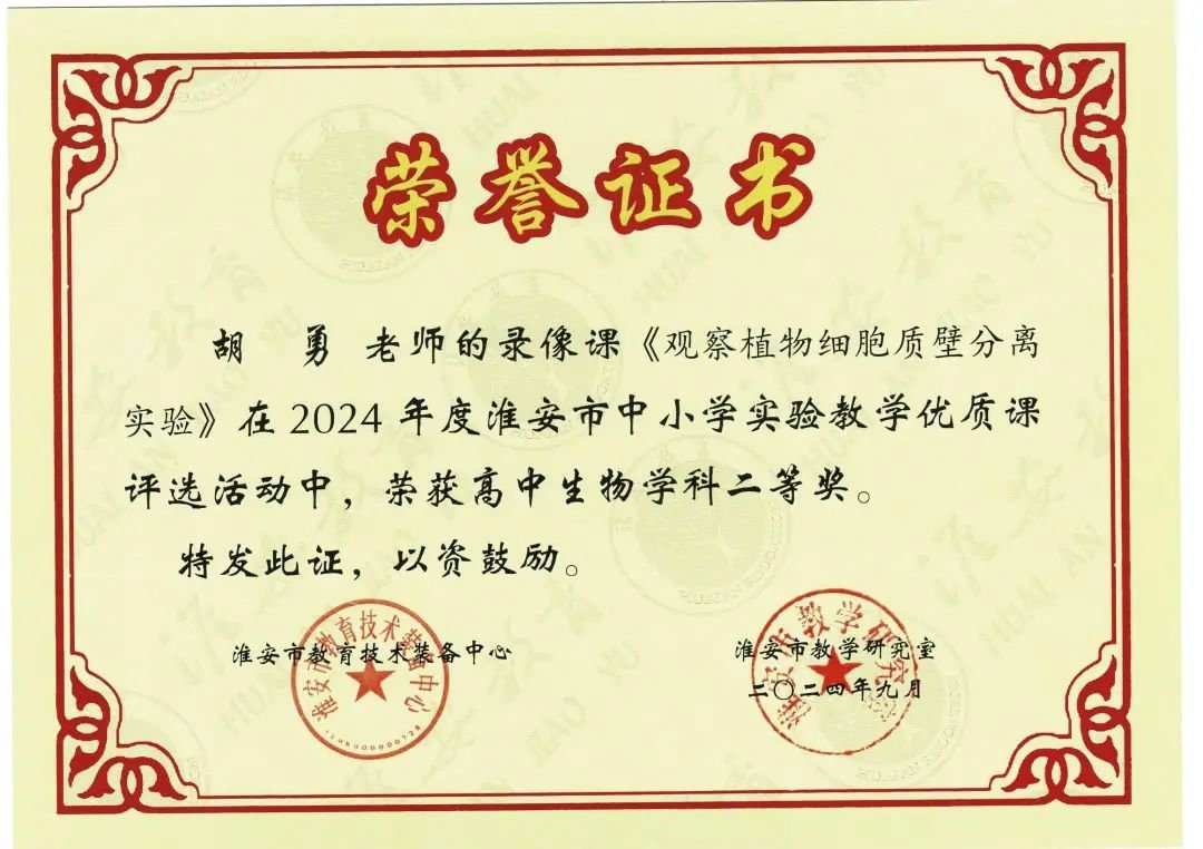 近日,从淮安市教育技术装备中心传来喜讯:在2024年度淮安市中小学实验教学说课优秀案例评选中,汤明乾老师荣获高中物理组一等奖、王超老师荣获高中生物组一等奖、胡勇老师荣获高中生物组二等奖、徐慧老师荣获高中化学组二等奖、曹羽宣老师荣获高中化学组二等奖;在2024年度淮安市中小学实验教学优质课评选中,林爽老师的录像课《实验探究——氢氧化亚铁的制备》荣获高中化学学科一等奖、李思源老师的录像课《探究打印机墨粉中的铁元素》荣获高中化学学科一等奖、王超老师的录像课《降低化学反应活化能的酶》荣获高中生物学科一等奖、胡勇老师的录像课《观察植物细胞质壁分离实验》荣获高中生物学科二等奖。