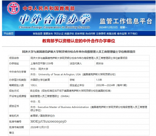 从我们接到的一些咨询案例来看,企业高管们了解硕博项目,很多时候不单单是为了一份学历。企业管理者们在离开校园多年后,可能会在某个阶段陷入工作上的瓶颈,感到“心有余而力不足”,这时,就需要重新回到学校里“充电”,学习最前沿的商业领域知识技能。所以,很多高校都针对这类高端人群推出了EMBA项目。 今天深圳真北咨询向小伙伴们分享同济大学-美国德克萨斯大学阿灵顿分校高级工商管理硕士EMBA项目。同济大学是底蕴深厚的老牌工科985,管理学学科更是在全国名列前茅!这个项目无需参加研究生统考,可选择中文授课,可在职学习,专升本也可以申请。每年分春秋两季入学,学制1.5年,是快速拿高端文凭的好途径! 这个项目是经过教育部认证的正统中外合办项目,毕业后可以拿到美方院校授予的高级工商管理学位证书,并申请留服认证,相当于双证硕士!