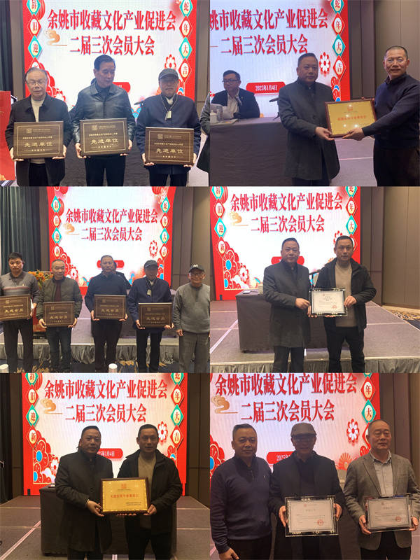 在表彰环节,大会对2024年度余姚市收藏文化产业促进会的先进会员和先进单位进行了表彰。胡志钧、杨雪涛两位副会长为2024年度先进会员颁发奖牌,郑登桥会长为三家先进单位代表颁发了荣誉证书。他们的努力和贡献得到了应有的认可,也激励着更多人为余姚市收藏文化产业的发展贡献力量。 随后,许立钢详细阐述了余姚市收藏文化产业促进会2025年度的工作计划,他提出了未来一年的工作目标和重点任务,为协会的发展指明了方向。余姚市社会科学界联合会领导黄士杰先生也出席了大会,并发表了重要讲话,他对余姚市收藏文化产业的发展给予了高度评价和支持,为促进会的发展注入了强大的动力。