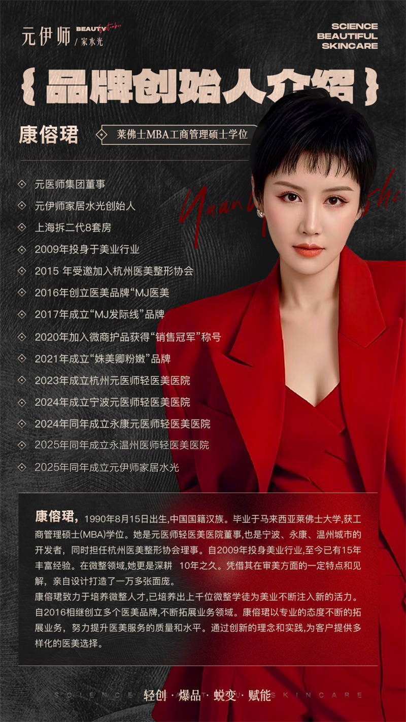 光居家水光的品牌创始人康傛珺出生于1990年8月,是马来西亚华人,毕业于马来西亚菜佛士大学,获工商管理硕士(MBA)学位。她是元医师轻医美医院董事,也是宁波、永康、温州城市的开发者,同时担任杭州医美整形协会理事。自2009年投身美业行业,至今已有15年丰富经验。元医师创始人康傛珺的妈妈从小就向她灌输了舍得和付出的理念,钱不是赚来的,而是在不断的帮助别人之后。上天给的回报!能成就多少人,就能有多大的收获!世界上最伟大的商业模式就是:利他,所以接触过康傛珺的人,都是知道她付出,大爱。