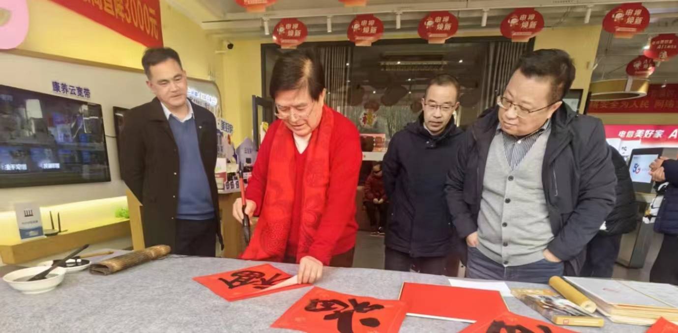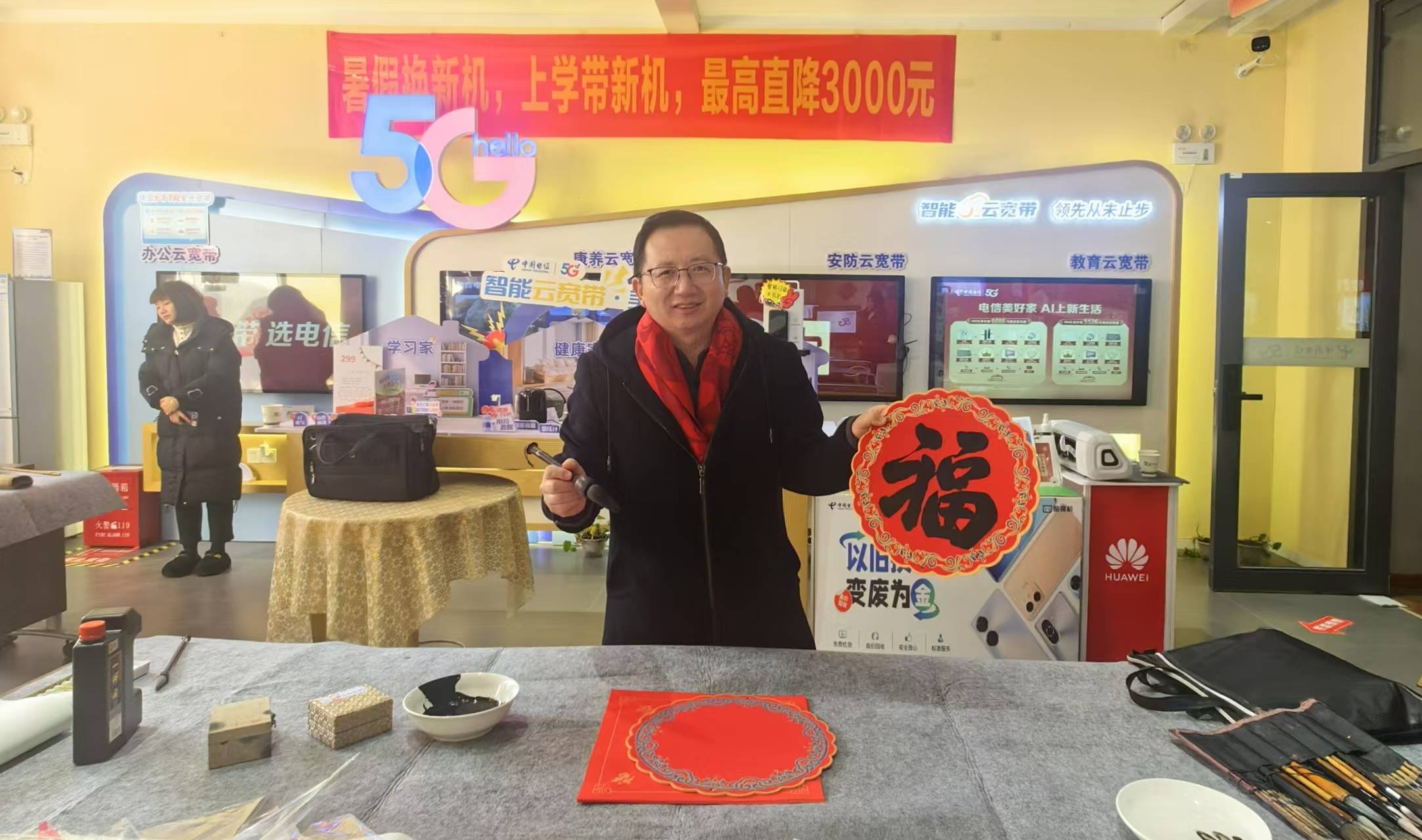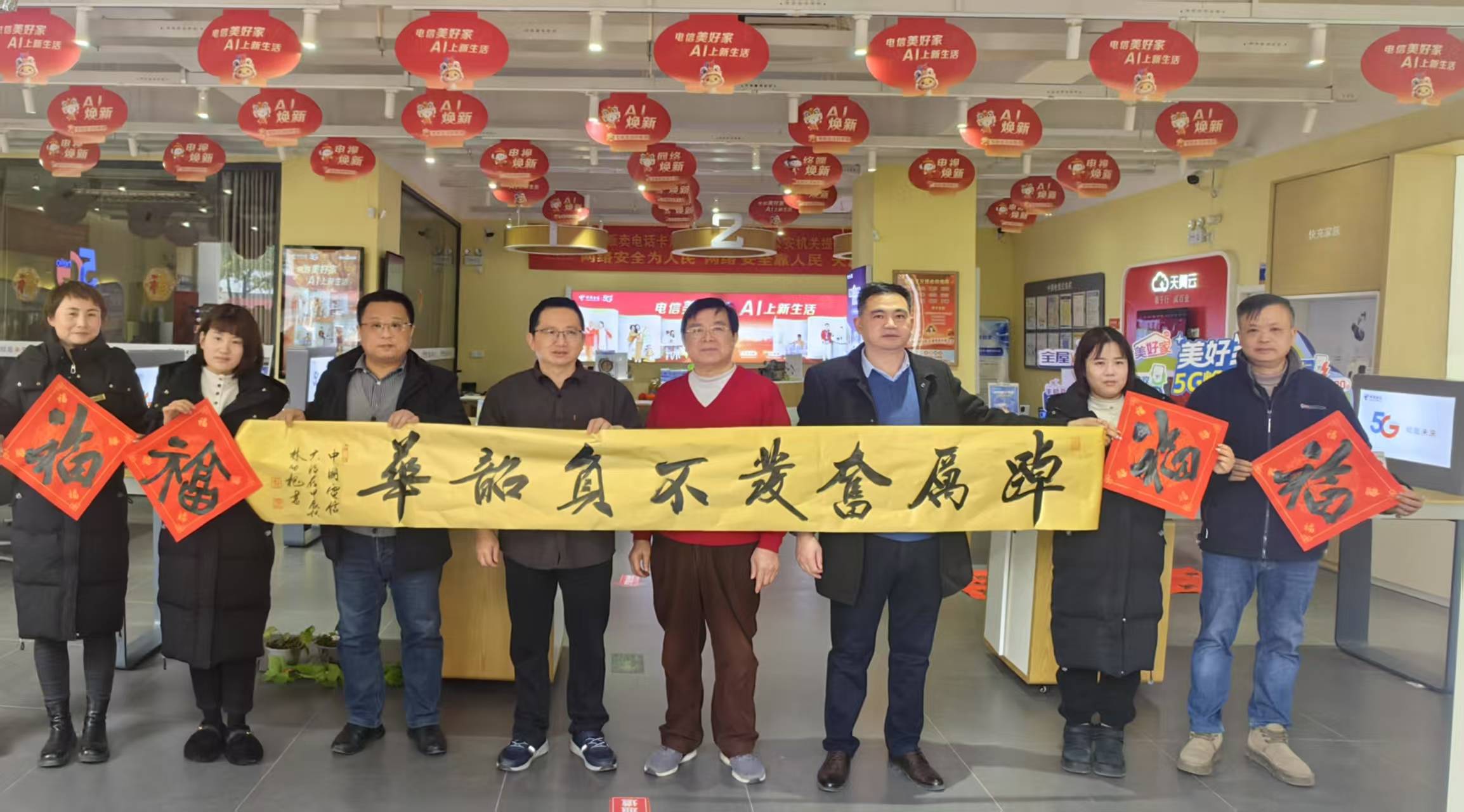 2025 年 1 月 20 日,正值大寒,在劲酒之乡大冶市电信公司营业厅内,却暖流涌动,墨香四溢。国家一级美术师、湖北天翼书画家协会主席林幼槐,湖北省硬笔书法家协会副主席、湖北省天翼书画家协会秘书长陈艾,一路驱车逾百公里,亲临此地,为电信客户与员工写春联、送祝福。