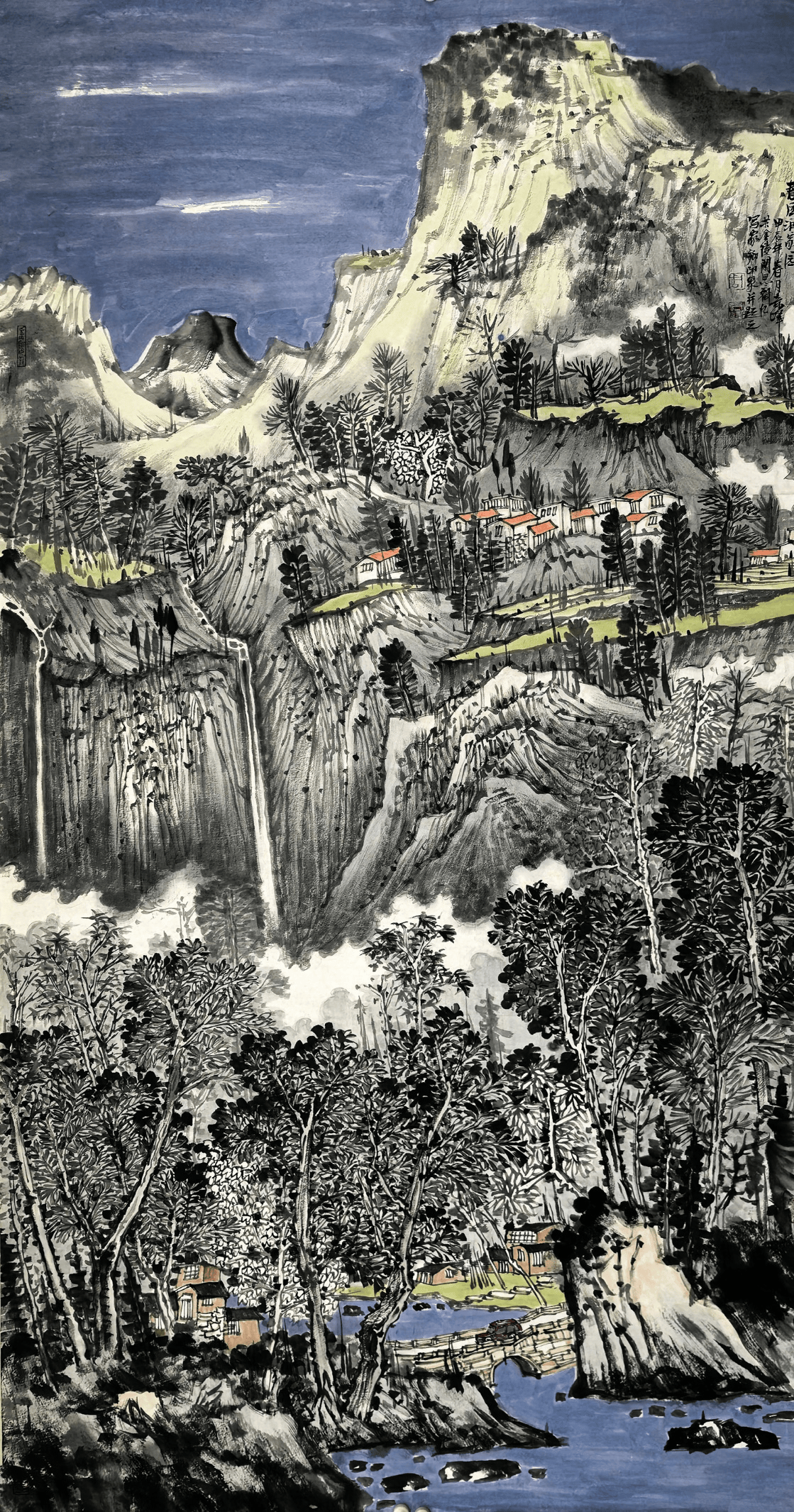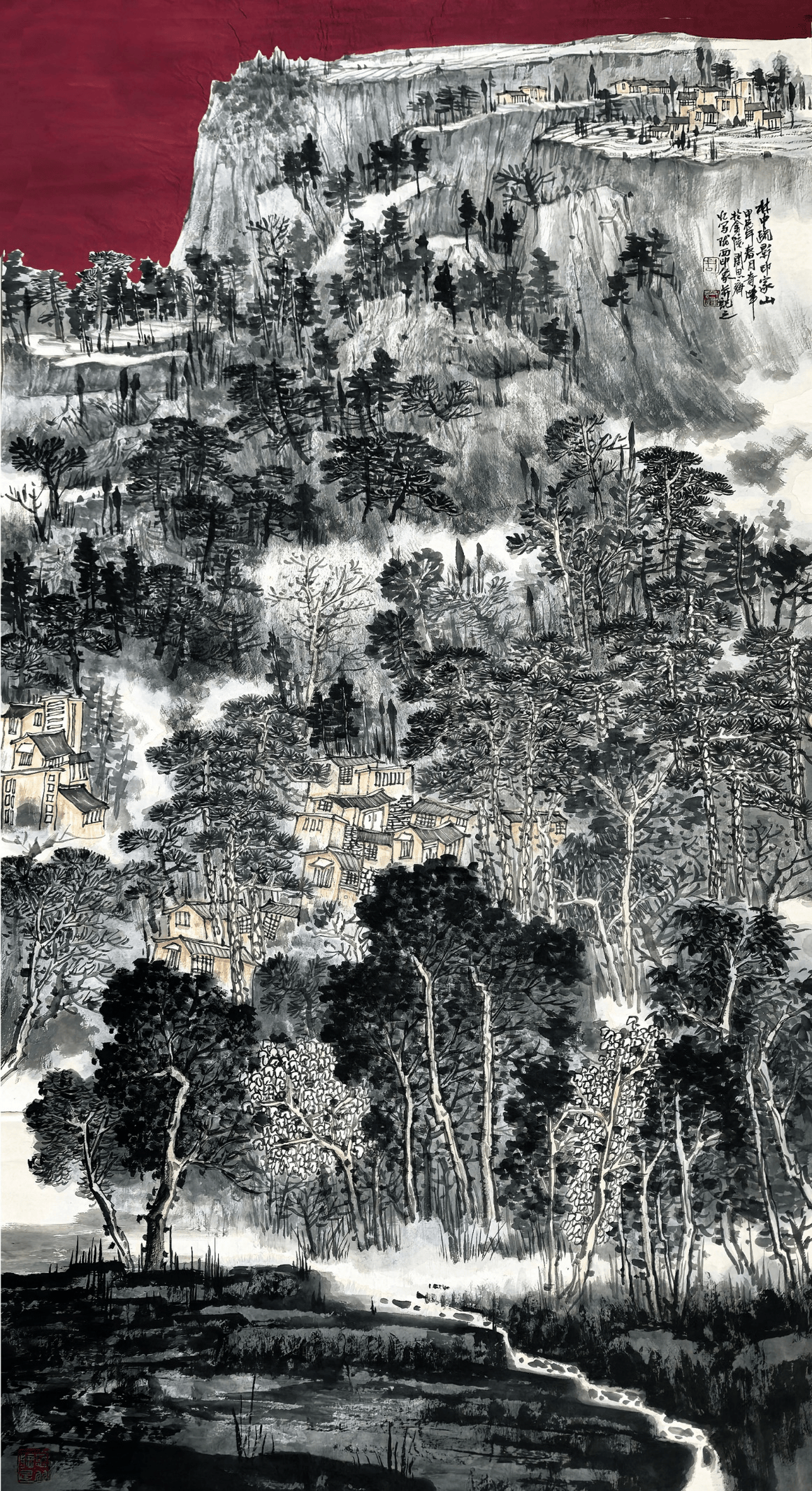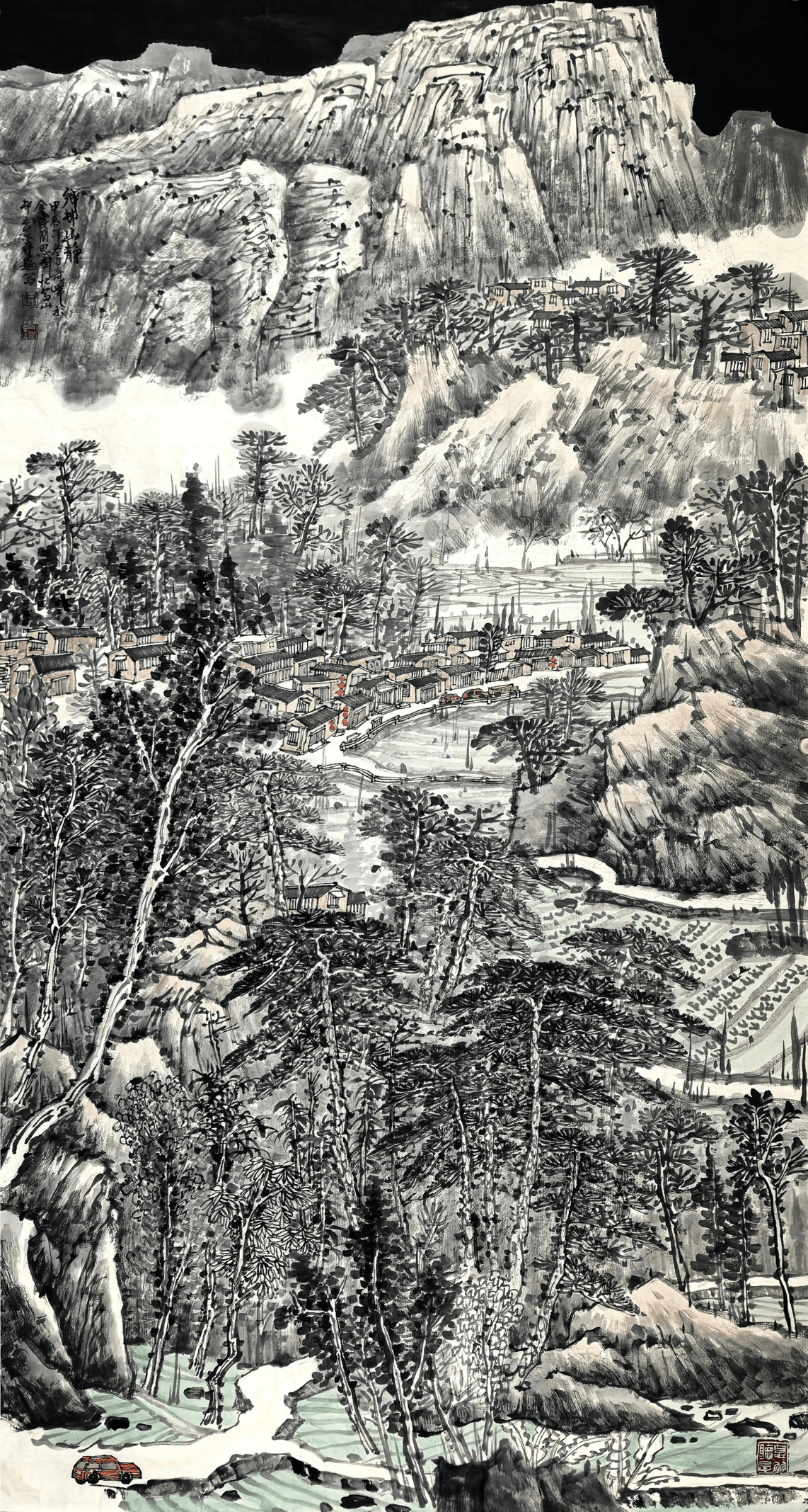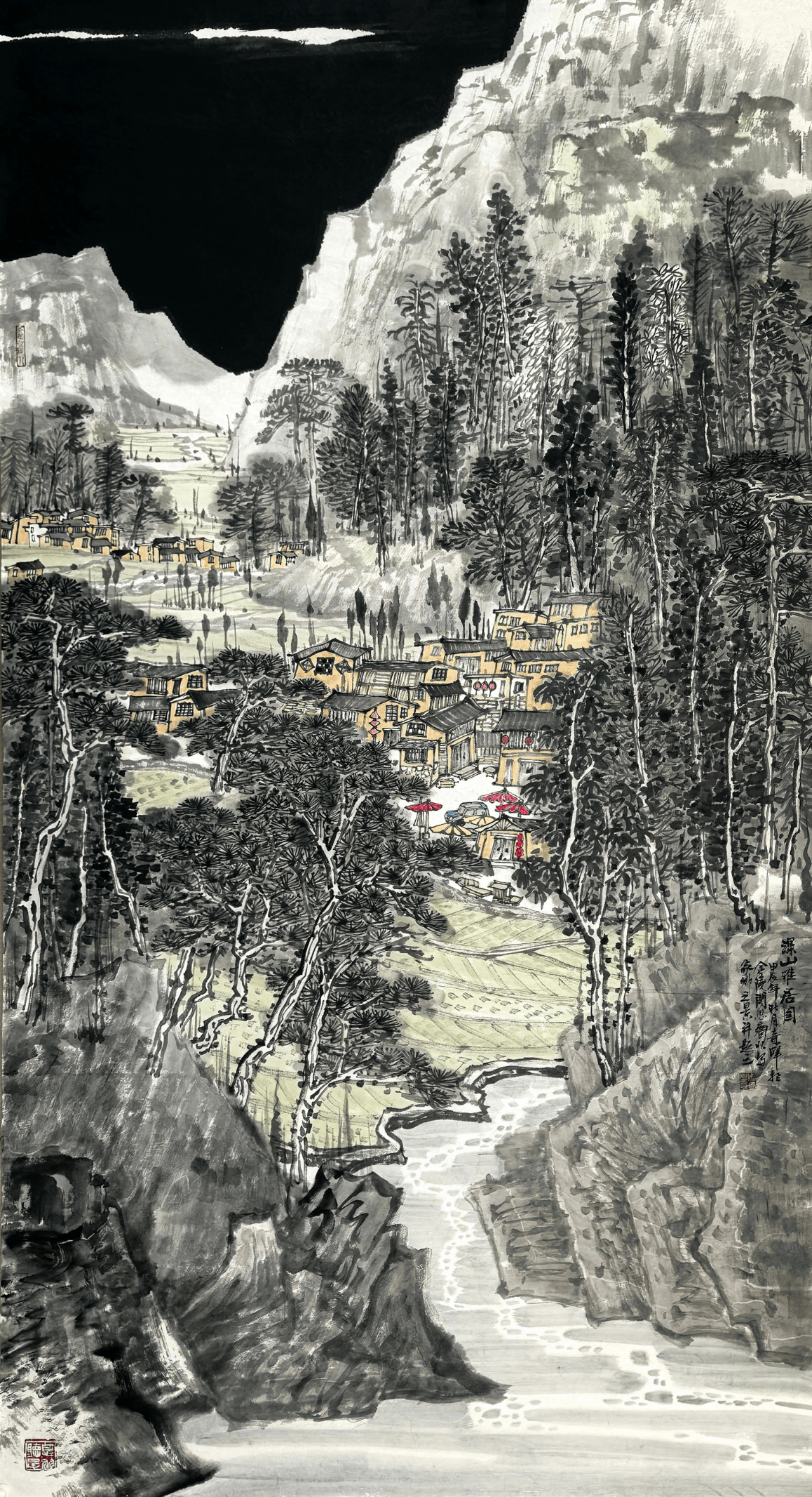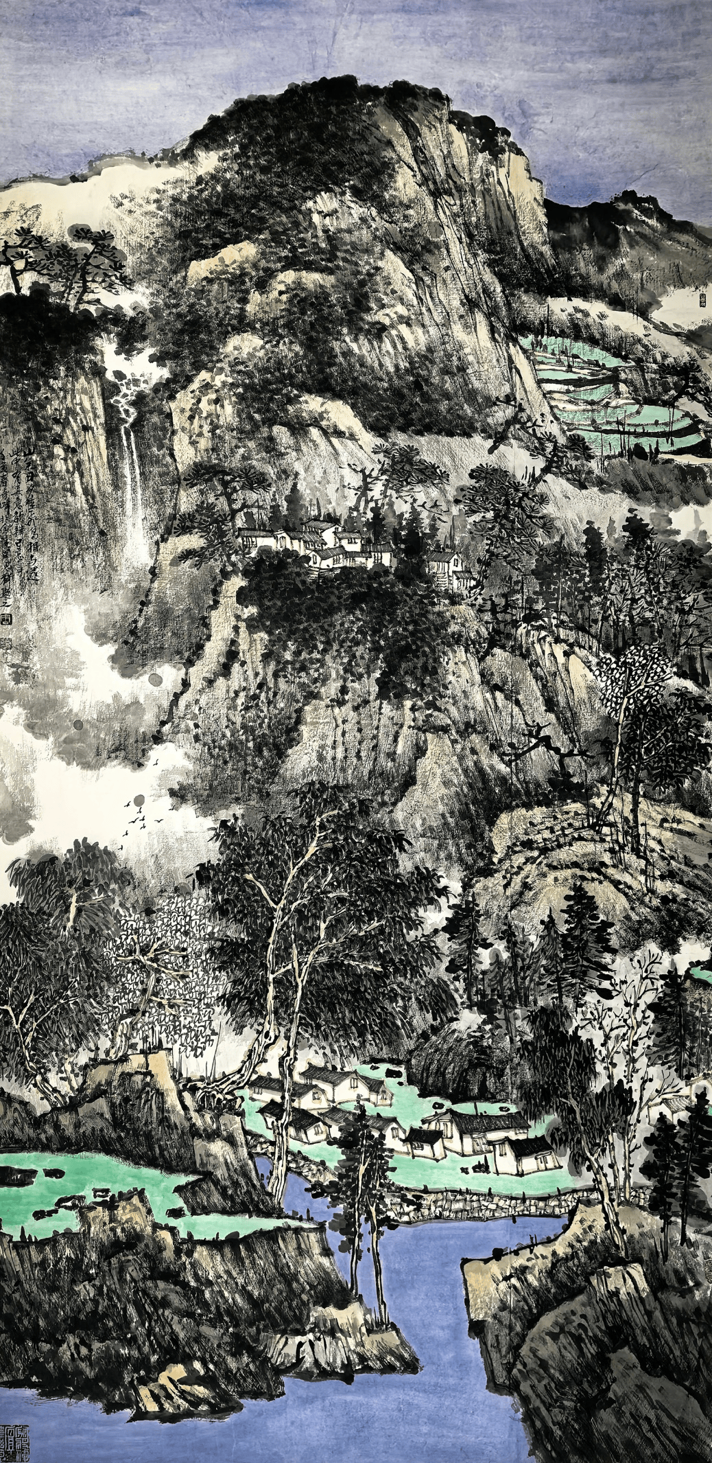 艺融南北 雄中有秀 ——析周奇峰的山水画境 由于画家所处的自然环境、艺术理念、师承关系和审美取向的不同,从目中山水到笔下山水必生各异。 山水画自五代北宋始分南北方两大风格流派,在北方以荆浩、关仝和范宽为代表,画中山水峻拔、劲挺、深厚,笔意枯老具有雄润伟美的气格;而江南山水则以董源为宗,画中峰峦重叠、云雾明晦、湖泊遍布,笔意润泽华滋,具有清逸秀润之美,后继者各师其宗径渭分明。如今交通便利发达已无东西南北之闭,画家亦见多识广,目及天下山水搜于胸中,依着自己的个性和审美喜好自创山水画。南京周奇峰是位艺融南北的金陵山水画又一家。