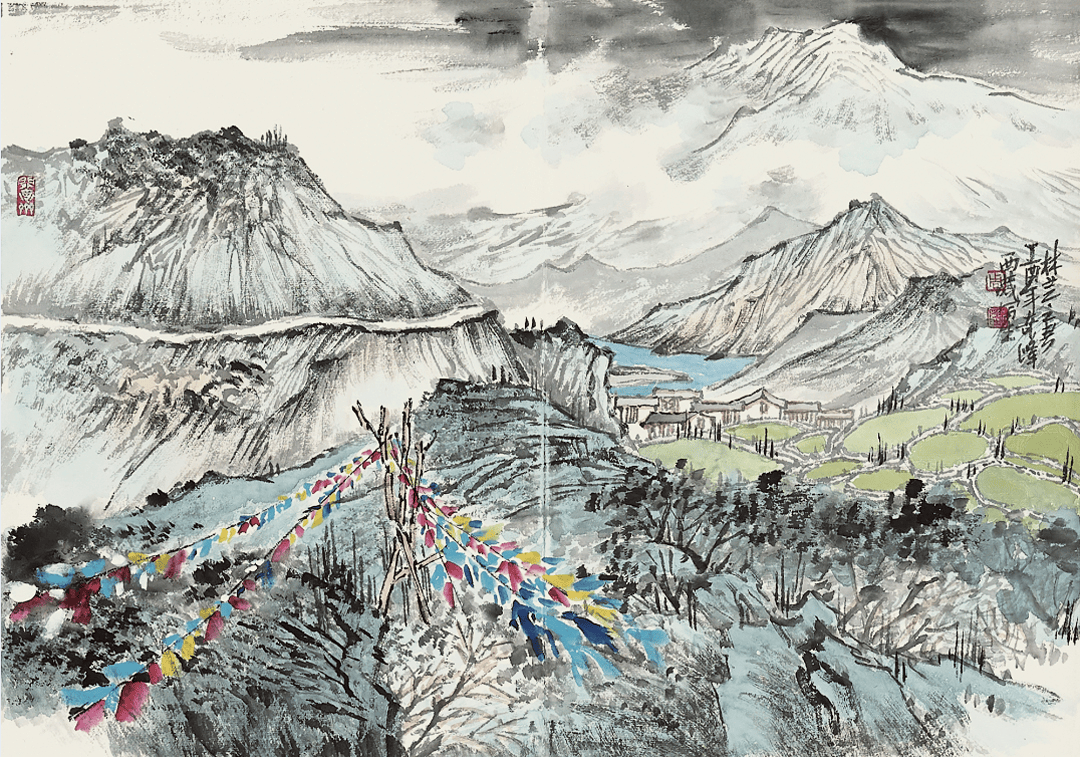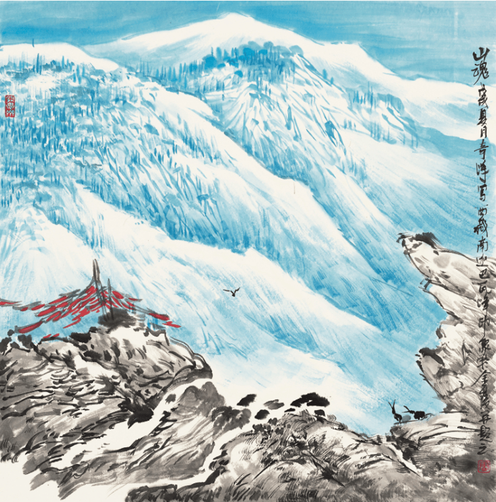 如果比喻笔是画之骨,那么墨就是画之肉,而色彩则是画之肤。山水画气质求苍润,苍是用笔,而润则是由墨彩而生。山水画家能做到笔下生骨气,墨彩有韵致,那作品就达到气韵生动的至高境界。 在奇峰的山水画中善用笔与墨,水墨交融,淋漓尽致。所以他所营造的山势山体富有骨气与灵魂。